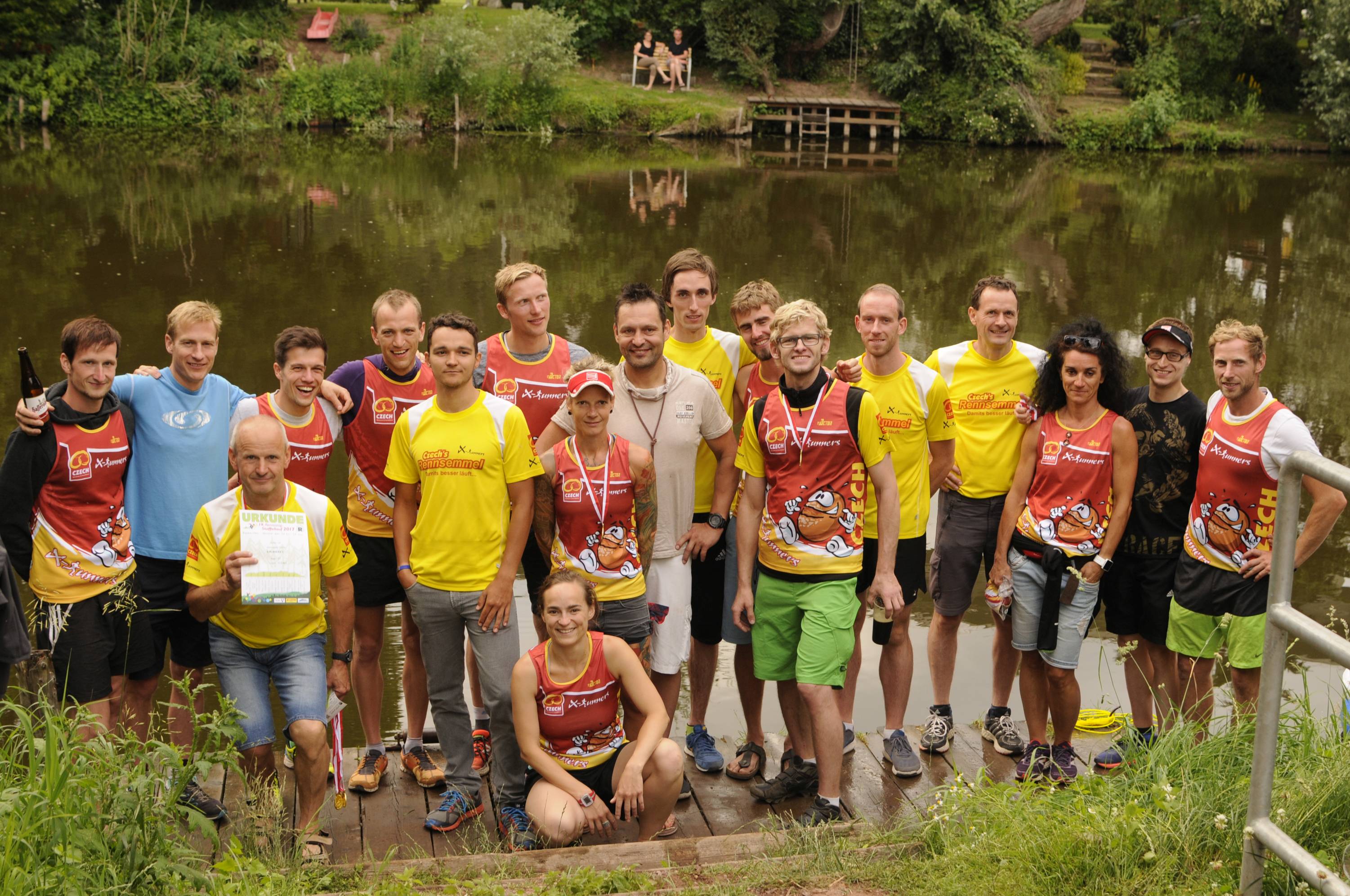 Unser Mixed-Team ging in folgender Besetzung auf die Strecke: 1. Jörg Neubauer 2. Felix Gaube 3. Kathleen Alles 4. Hagen Voigt 5. Anja Lonschinski 6. Ralf Mehr 7. Claudia Behrend 8. Stephanie Weber 9. Frank Hausmann 10. Margarete Voigt. Die Radbegleitung übernahmen Elmar Steiner (1-5. Etappe) und Georg Glück (6.-10. Etappe). Janett Pertsch fungierte als Team-Coach, sicher mit dem Kribbeln im (noch) verletzten Bein, nächstes Jahr wieder mit auf der Strecke zu sein. In der Endabrechnung springt nach 14:02:15 der 9. Platz der Mixed-Wertung (44. in der Gesamtwertung heraus). Das ist immer noch ein Kilometerschnitt unter 5 Minuten. Klasse.