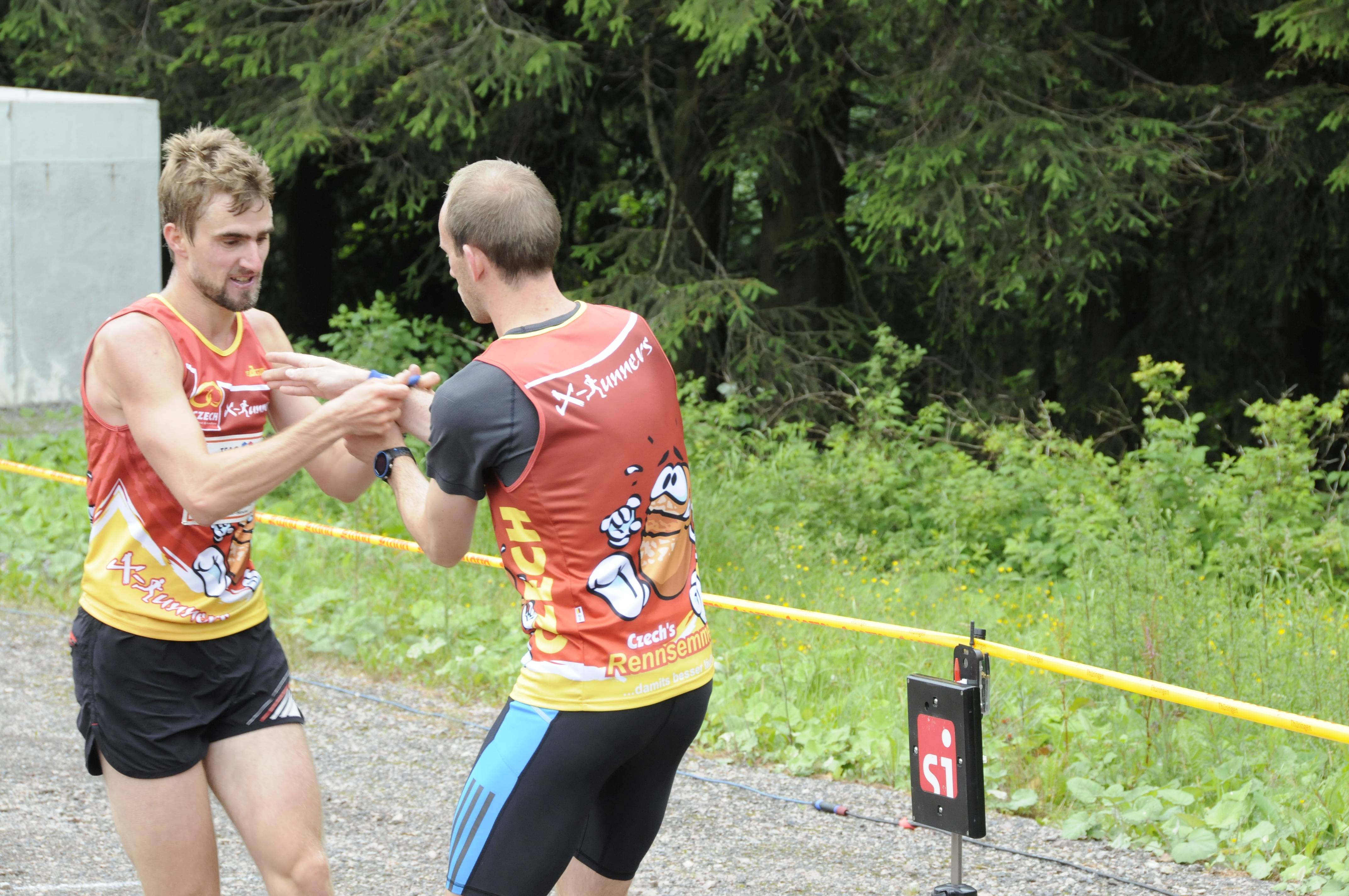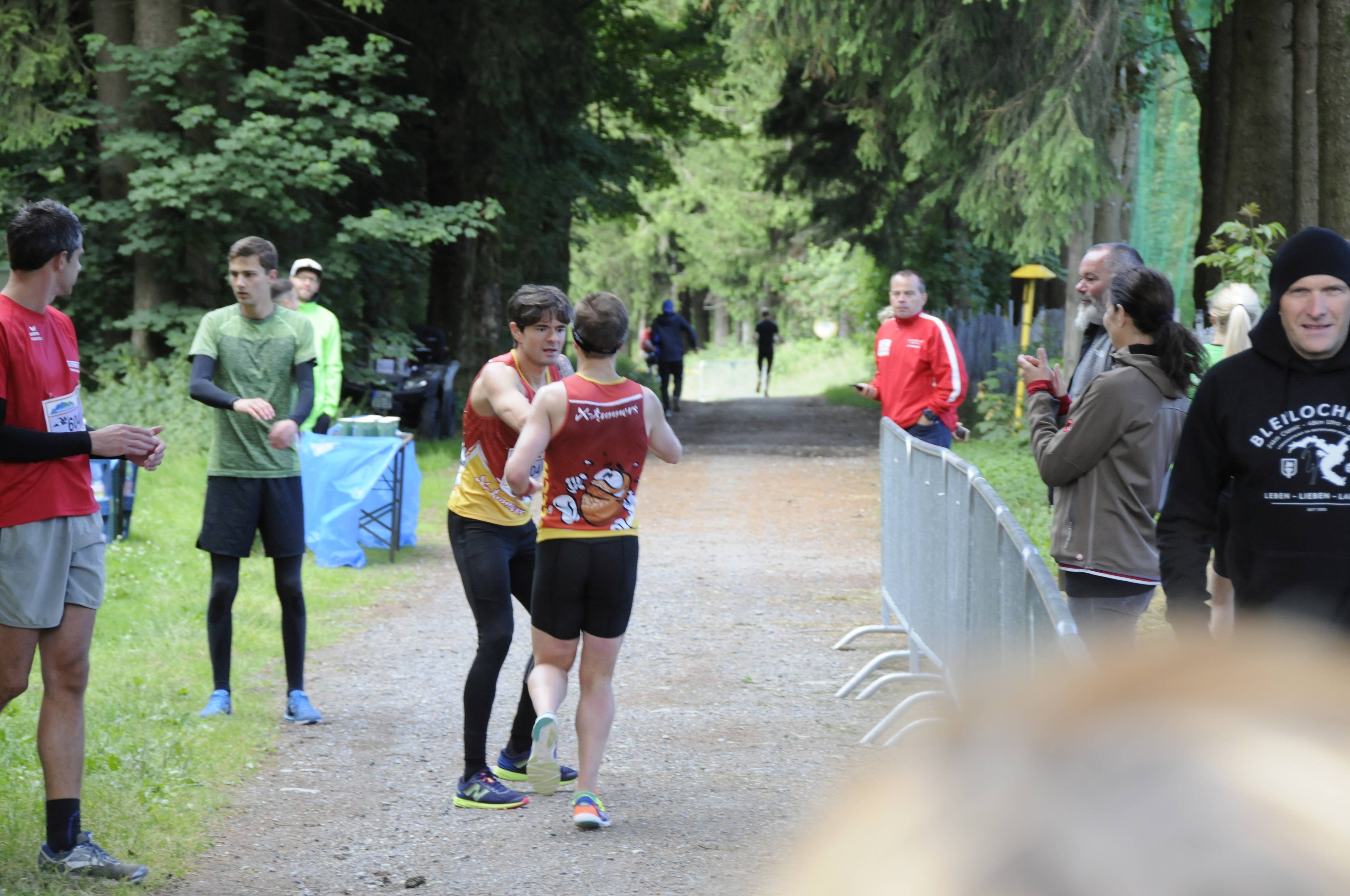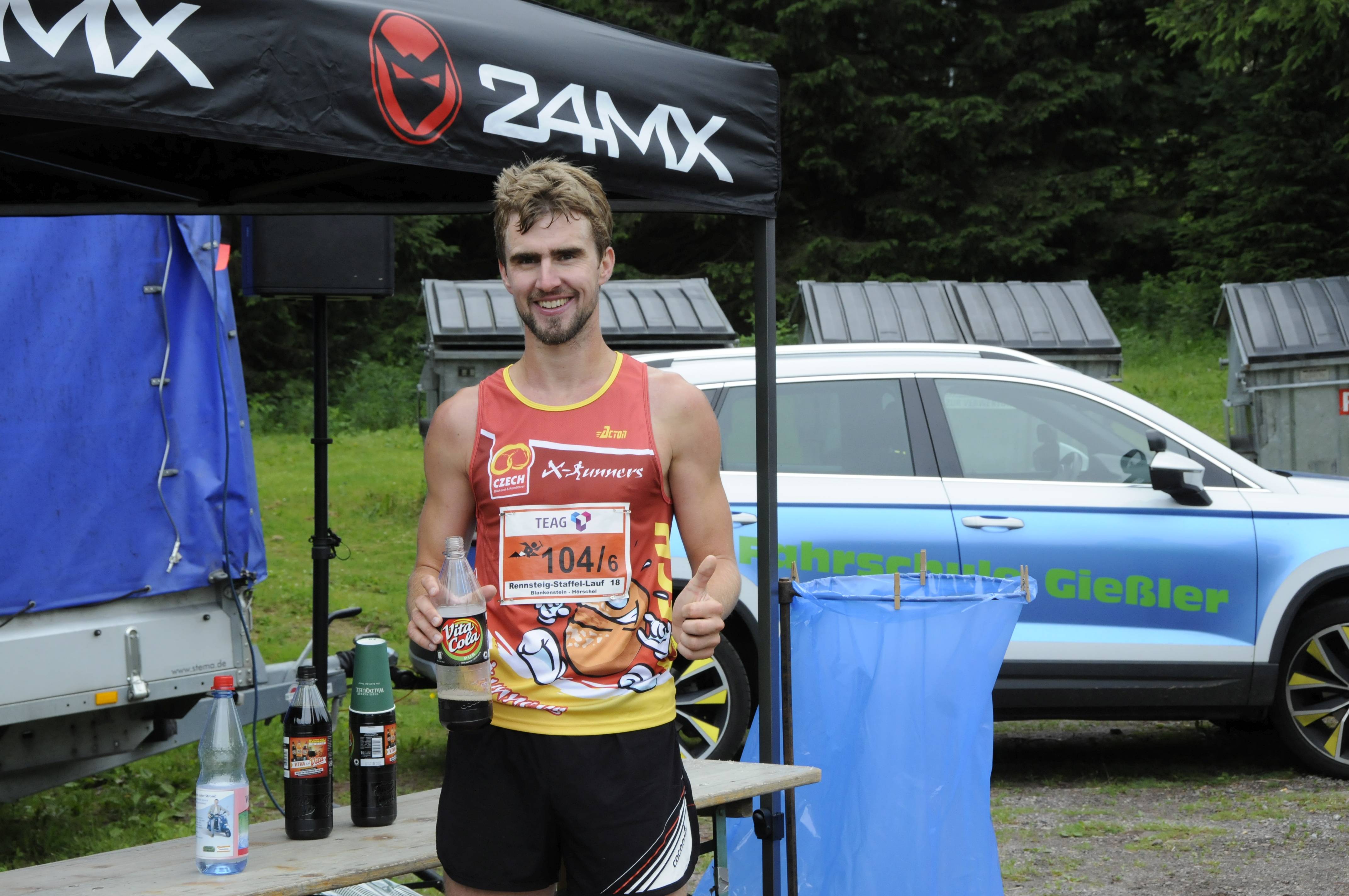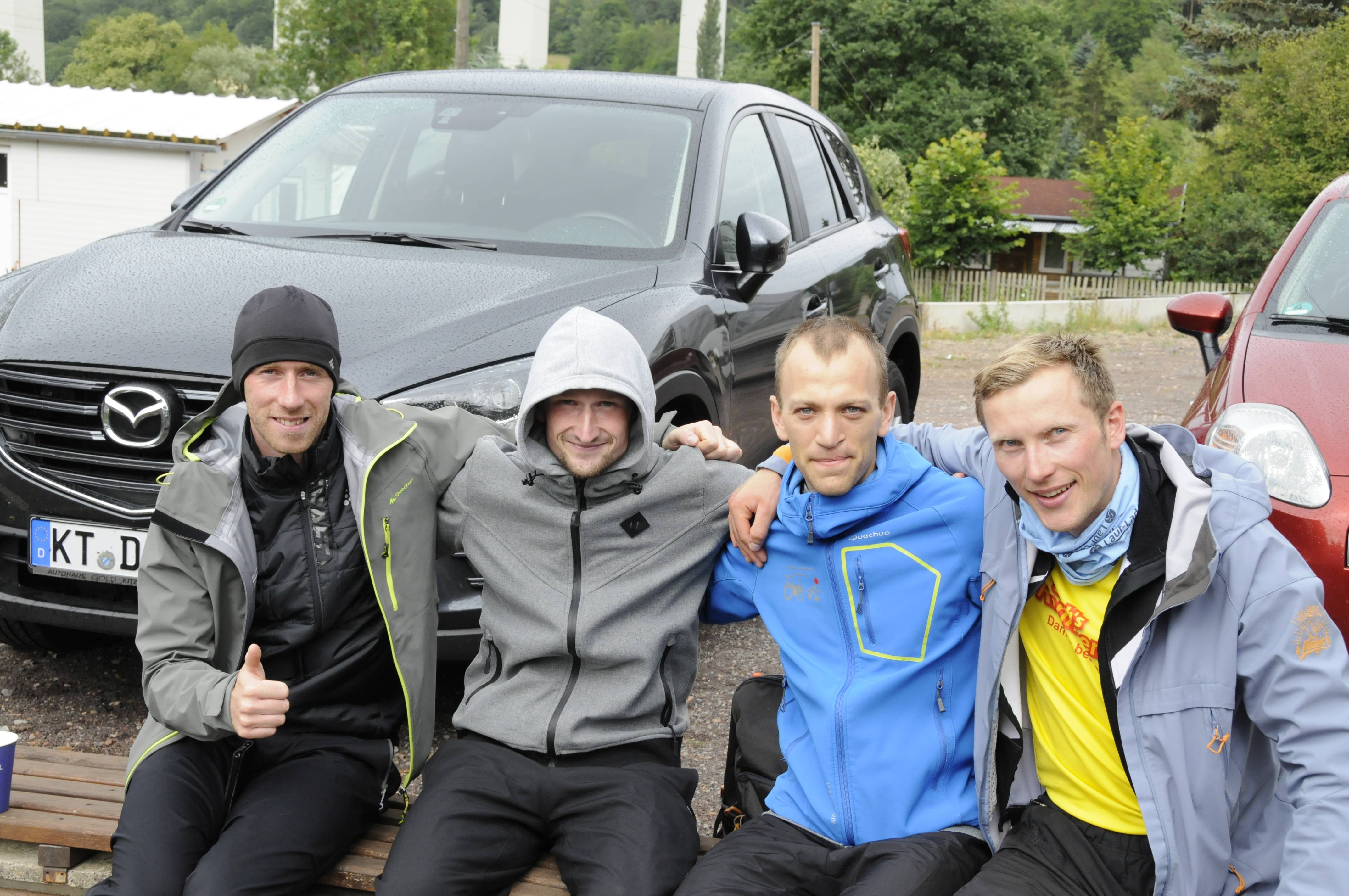 Für Männer 1 gab es im Vergleich zum Vorjahr nur eine Veränderung. Stephan Holesch musste verletzungsbedingt passen. Für ihn rutschte Patrice Walter ins Team. An dieser Stelle auch danke an seinen Team-Geist, dass er sich zunächst für das Mixed-Team bereithielt und dann aufrutschte. Stephan war trotzdem dabei und gestand, dass er in der Begleiter-Rolle ebenso aufgeregt sei, wie die Vorjahre als Läufer (Willkommen in dieser Perspektive). Chunky Liston nutzte den Ansporn als junger Vater, übergab als erster und verbesserte sich zum Vorjahr um über eine Minute. Theo Popp (ebenfalls frischgebackener Papa) baute den Vorsprung eine weitere Minute aus. Selbiges gelang Sebastian Seyfarth auf dem 3. Abschnitt. Patrice konnte die Zeit von Stephan aus Vorjahr leicht unterbieten und den Vorsprung halten. Willi Paufler auf der ihm bekannten 5. Etappe packte noch eine Minute Vorsprung drauf (inzwischen auf mehr als 4 Minuten angewachsen). Zu diesem Zeitpunkt hatte Bernd Ballhausen seine Radbegleitung bravourös absolviert und die Bratwurst und das Radler mehr als verdient. Für die Königsetappe über den Beerberg schnürte Florian Lecht die Schuhe und konnte den Abstand zu Günter`s Männern in Kenianischer Besetzung nahezu konstant halten. Der Rennsteiglaufverein lief hier fast auf Platz 2 auf; damit waren am 6. Wechsel 3 Teams binnen 4 Minuten unterwegs. Tobias Schröder packte in tiefen 49 min auf Etappe 7 eine Bestzeit aus. Bei nunmehr nicht untypischer Witterung mit Regen und einstelligen Temperaturen übernahm Lucas Schädlich die konstante Führung. Er unterbot seine Vorjahres- und Planzeit. Trotzdem kamen die Verfolger auf. Thomas Häusler nahm knapp 2 Minuten auf die beiden Verfolger mit. Als er etwa nach etwa der Hälfte der Strecke von Marcel Krieghoff überholt wurde (ein „ebenso bekannter Wintersportler, wie viele andere eingekaufte Läufer“ 😉 hielt Thomas den Abstand bis zum Wechsel auf ca. 20 Sekunden konstant. Zugleich verbesserte er seine All-Time Bestzeit auf dieser Etappe auf unter 1:09 Stunden und vergrößerte den Abstand nach hinten. Marius Faber versuchte sofort nach vorn aufzulaufen. Als er merkte, dass dieses womöglich über die Kräfte geht, lief er kontrolliert zu eigener Bestzeit und wurde nach knapp 2 Minuten Rückstand als Zweiter gefeiert. Die Radbegleitung teilten sich Hagen Voigt und Andrè Bräuer. Die 10:32:31 Stunden bedeuteten Vereinsrekord. In Anbetracht dessen, dass auch unsere geplante Zielzeit um 2 Minuten unterboten wurde, kann man nur sagen: Tolles Mannschaftsergebnis!