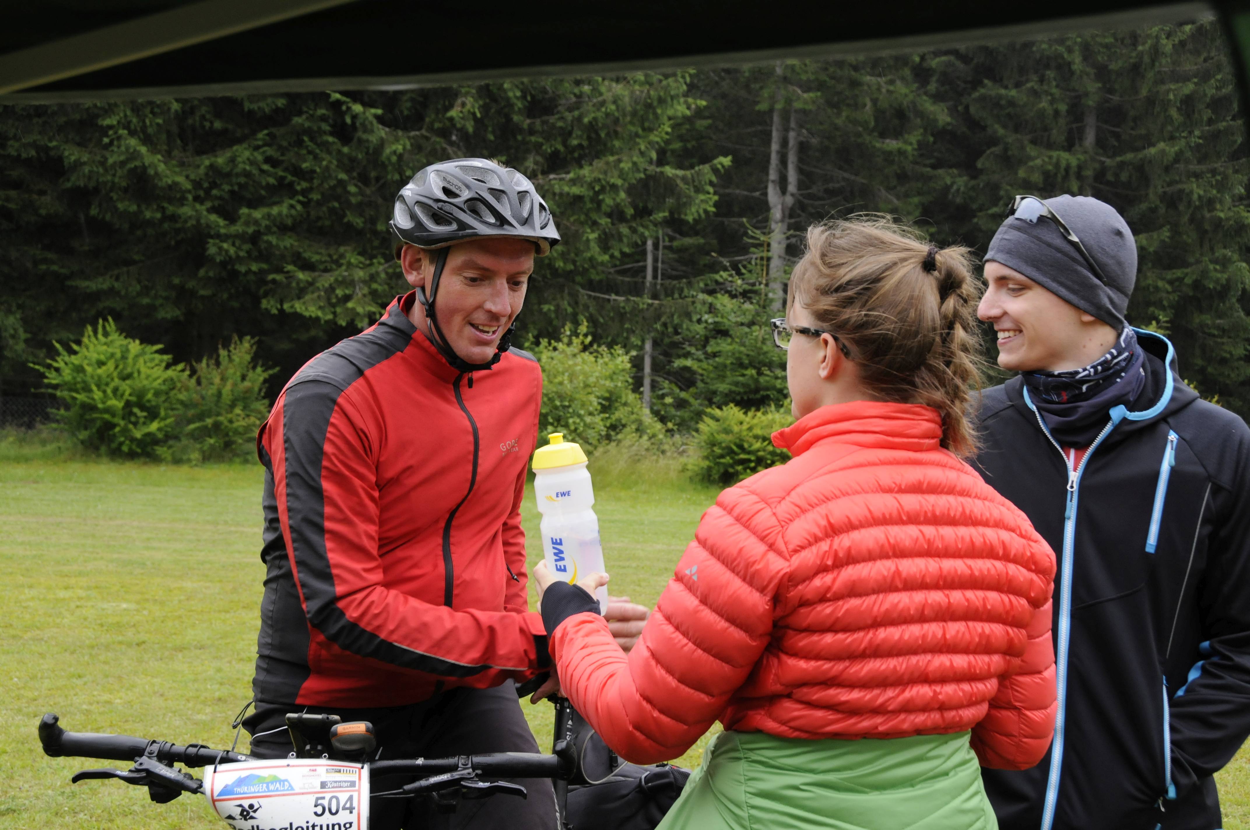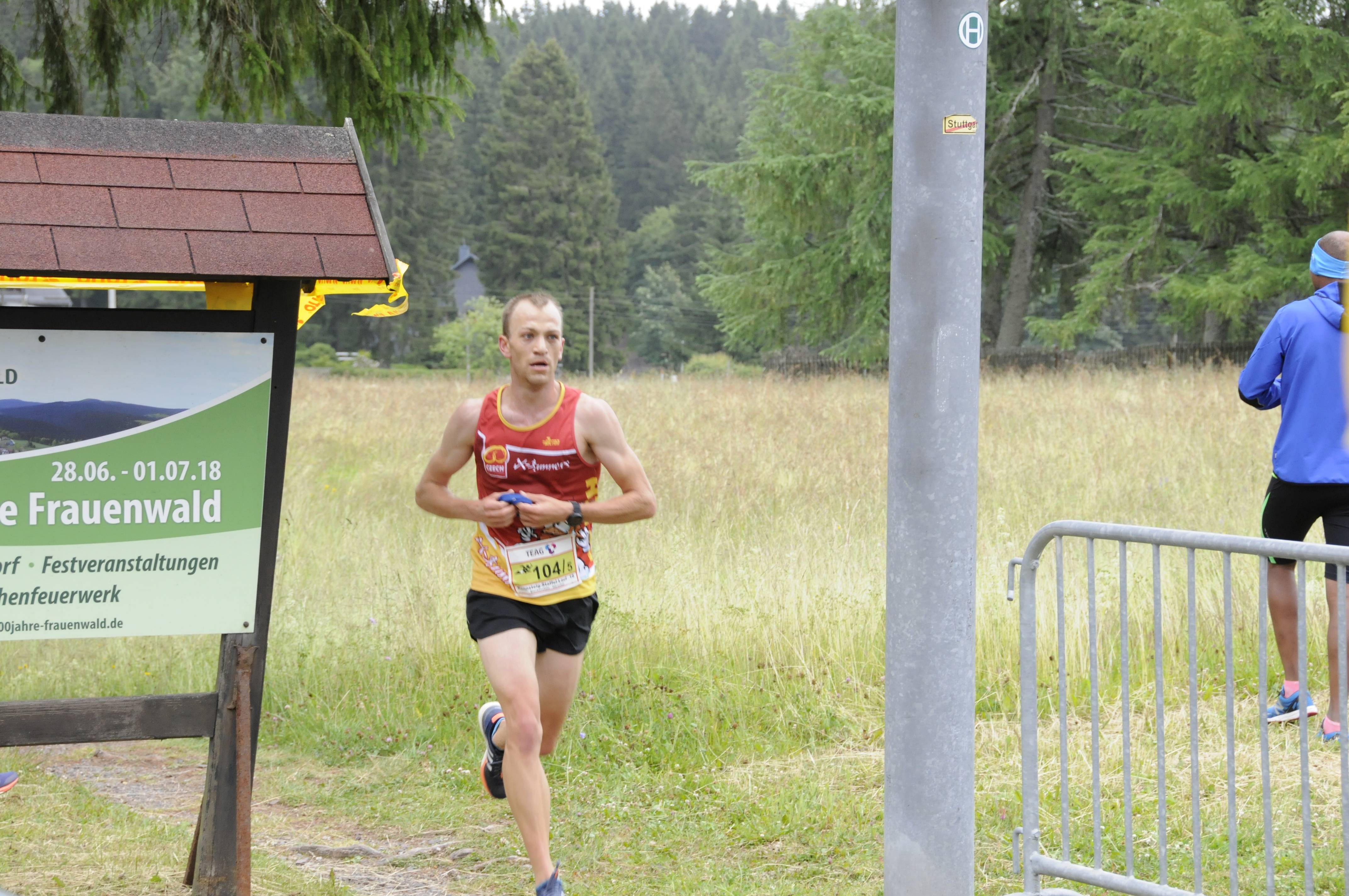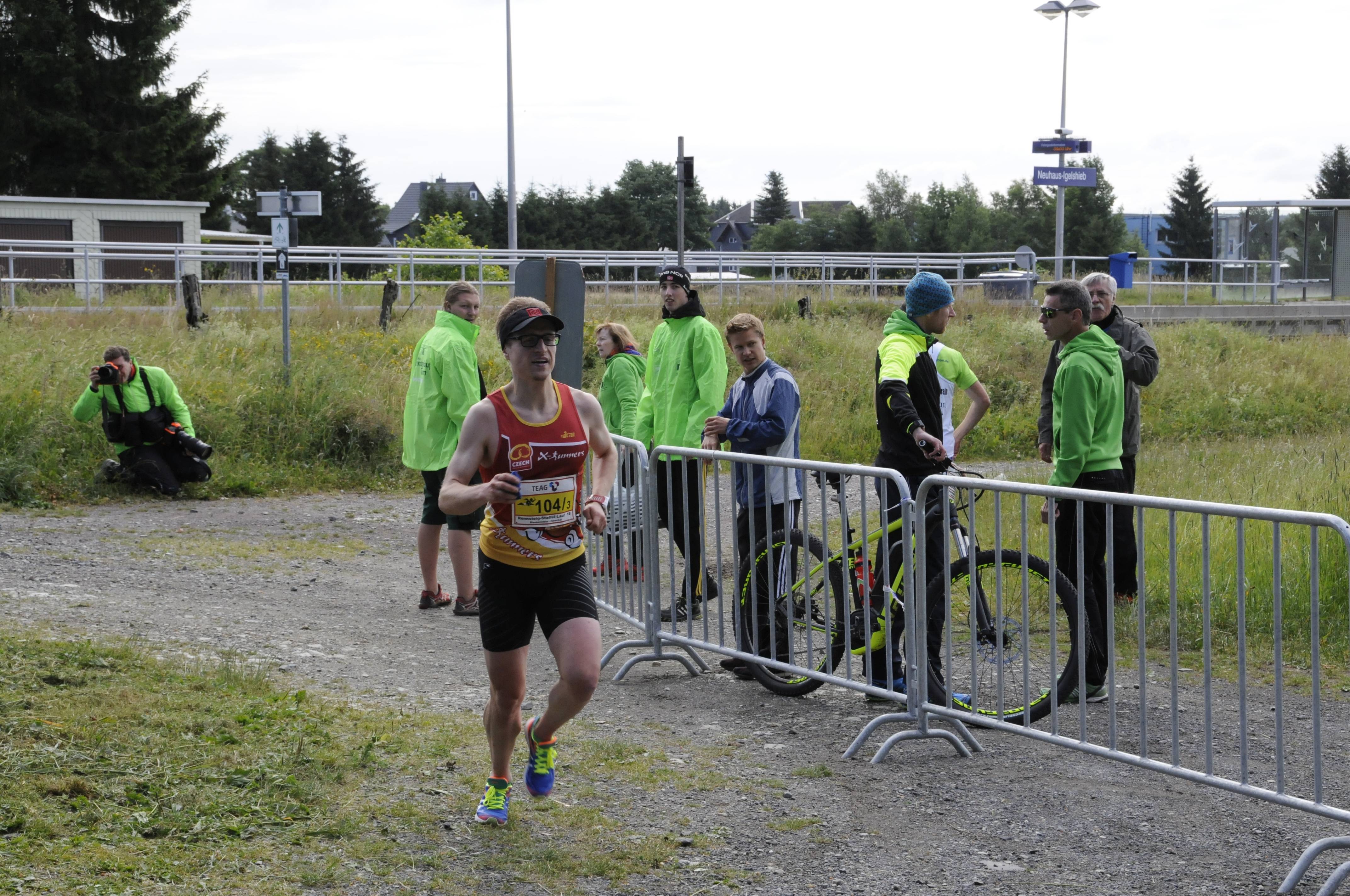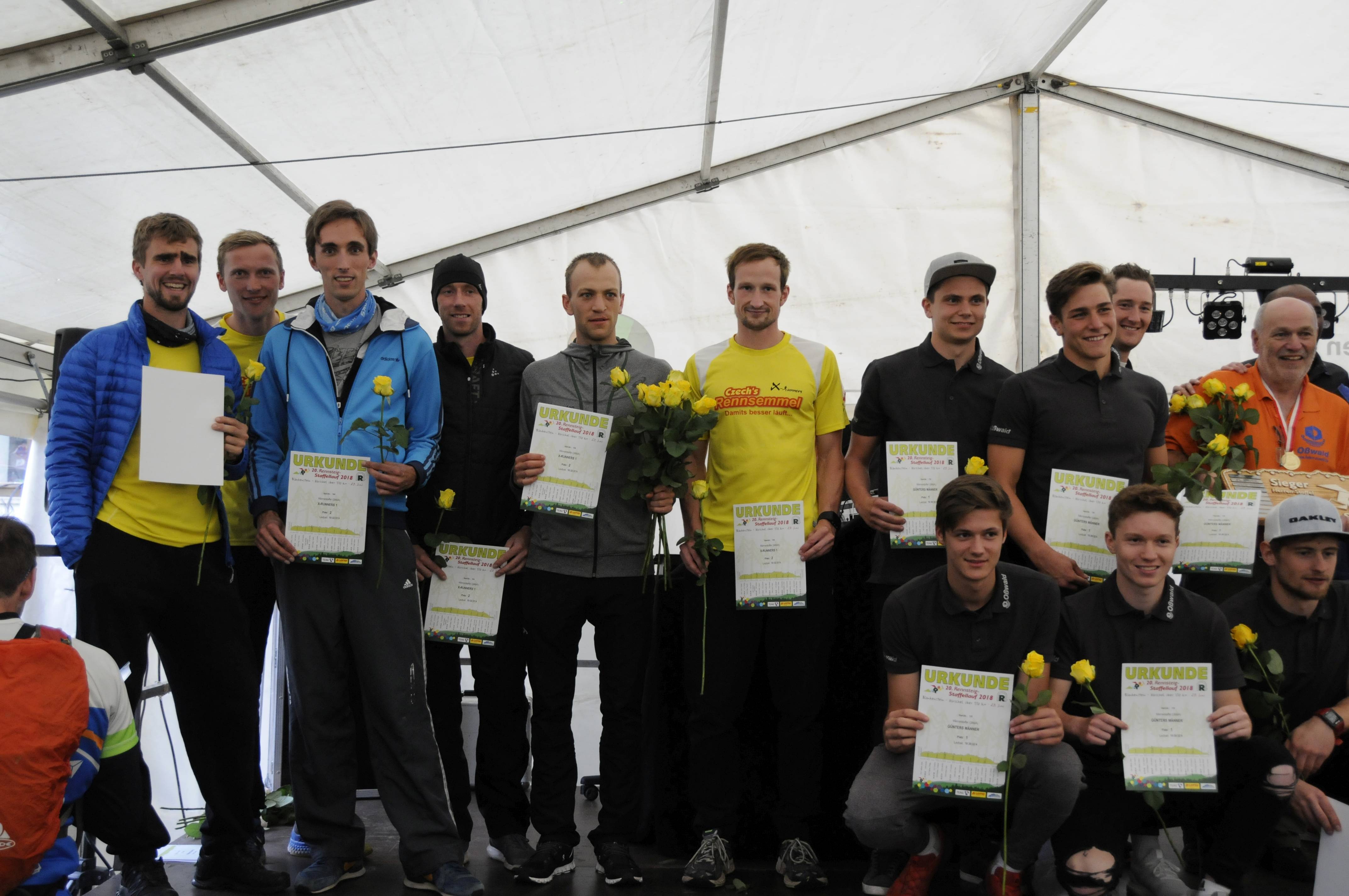 Für Männer 1 gab es im Vergleich zum Vorjahr nur eine Veränderung. Stephan Holesch musste verletzungsbedingt passen. Für ihn rutschte Patrice Walter ins Team. An dieser Stelle auch danke an seinen Team-Geist, dass er sich zunächst für das Mixed-Team bereithielt und dann aufrutschte. Stephan war trotzdem dabei und gestand, dass er in der Begleiter-Rolle ebenso aufgeregt sei, wie die Vorjahre als Läufer (Willkommen in dieser Perspektive). Chunky Liston nutzte den Ansporn als junger Vater, übergab als erster und verbesserte sich zum Vorjahr um über eine Minute. Theo Popp (ebenfalls frischgebackener Papa) baute den Vorsprung eine weitere Minute aus. Selbiges gelang Sebastian Seyfarth auf dem 3. Abschnitt. Patrice konnte die Zeit von Stephan aus Vorjahr leicht unterbieten und den Vorsprung halten. Willi Paufler auf der ihm bekannten 5. Etappe packte noch eine Minute Vorsprung drauf (inzwischen auf mehr als 4 Minuten angewachsen). Zu diesem Zeitpunkt hatte Bernd Ballhausen seine Radbegleitung bravourös absolviert und die Bratwurst und das Radler mehr als verdient. Für die Königsetappe über den Beerberg schnürte Florian Lecht die Schuhe und konnte den Abstand zu Günter`s Männern in Kenianischer Besetzung nahezu konstant halten. Der Rennsteiglaufverein lief hier fast auf Platz 2 auf; damit waren am 6. Wechsel 3 Teams binnen 4 Minuten unterwegs. Tobias Schröder packte in tiefen 49 min auf Etappe 7 eine Bestzeit aus. Bei nunmehr nicht untypischer Witterung mit Regen und einstelligen Temperaturen übernahm Lucas Schädlich die konstante Führung. Er unterbot seine Vorjahres- und Planzeit. Trotzdem kamen die Verfolger auf. Thomas Häusler nahm knapp 2 Minuten auf die beiden Verfolger mit. Als er etwa nach etwa der Hälfte der Strecke von Marcel Krieghoff überholt wurde (ein „ebenso bekannter Wintersportler, wie viele andere eingekaufte Läufer“ 😉 hielt Thomas den Abstand bis zum Wechsel auf ca. 20 Sekunden konstant. Zugleich verbesserte er seine All-Time Bestzeit auf dieser Etappe auf unter 1:09 Stunden und vergrößerte den Abstand nach hinten. Marius Faber versuchte sofort nach vorn aufzulaufen. Als er merkte, dass dieses womöglich über die Kräfte geht, lief er kontrolliert zu eigener Bestzeit und wurde nach knapp 2 Minuten Rückstand als Zweiter gefeiert. Die Radbegleitung teilten sich Hagen Voigt und Andrè Bräuer. Die 10:32:31 Stunden bedeuteten Vereinsrekord. In Anbetracht dessen, dass auch unsere geplante Zielzeit um 2 Minuten unterboten wurde, kann man nur sagen: Tolles Mannschaftsergebnis!