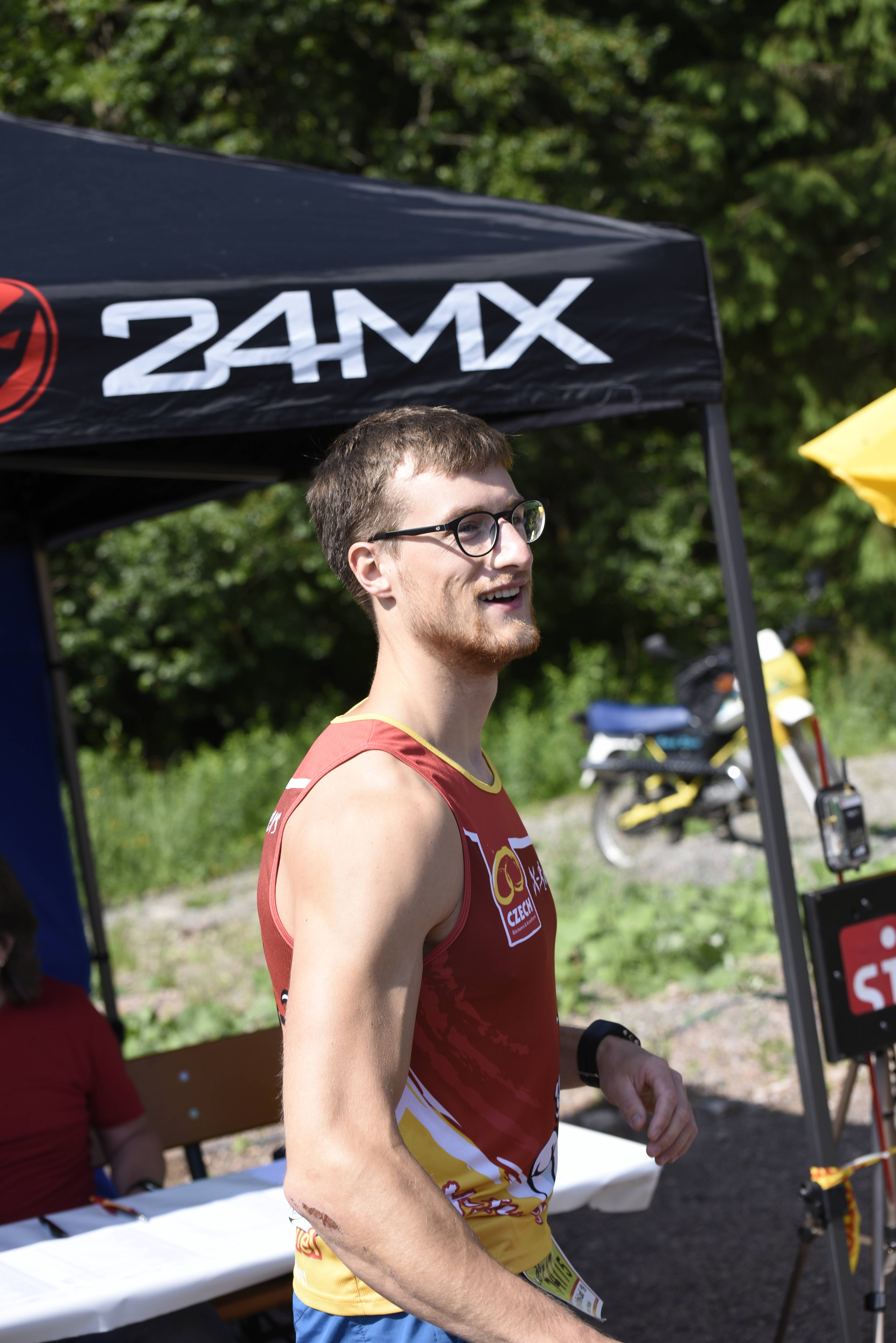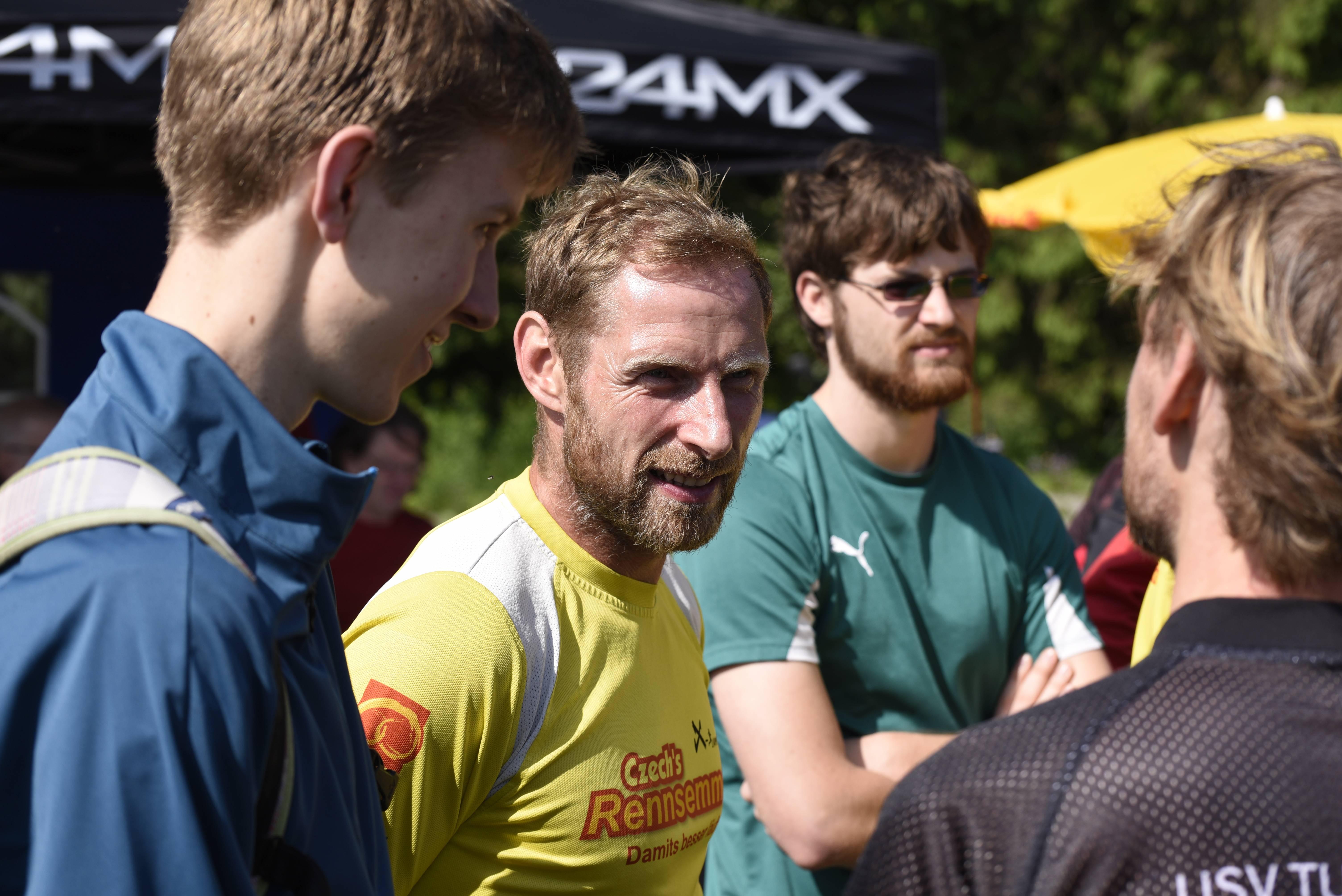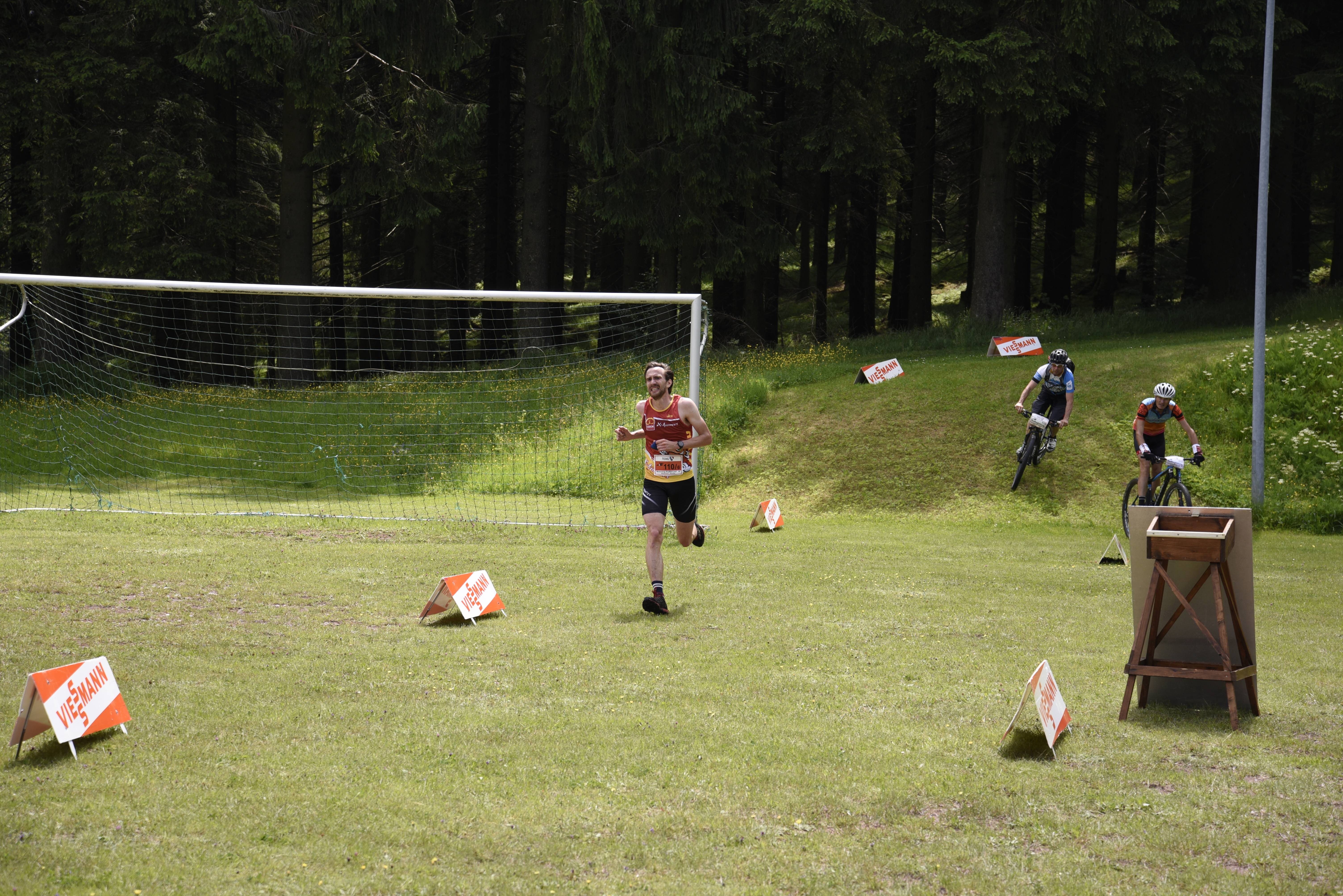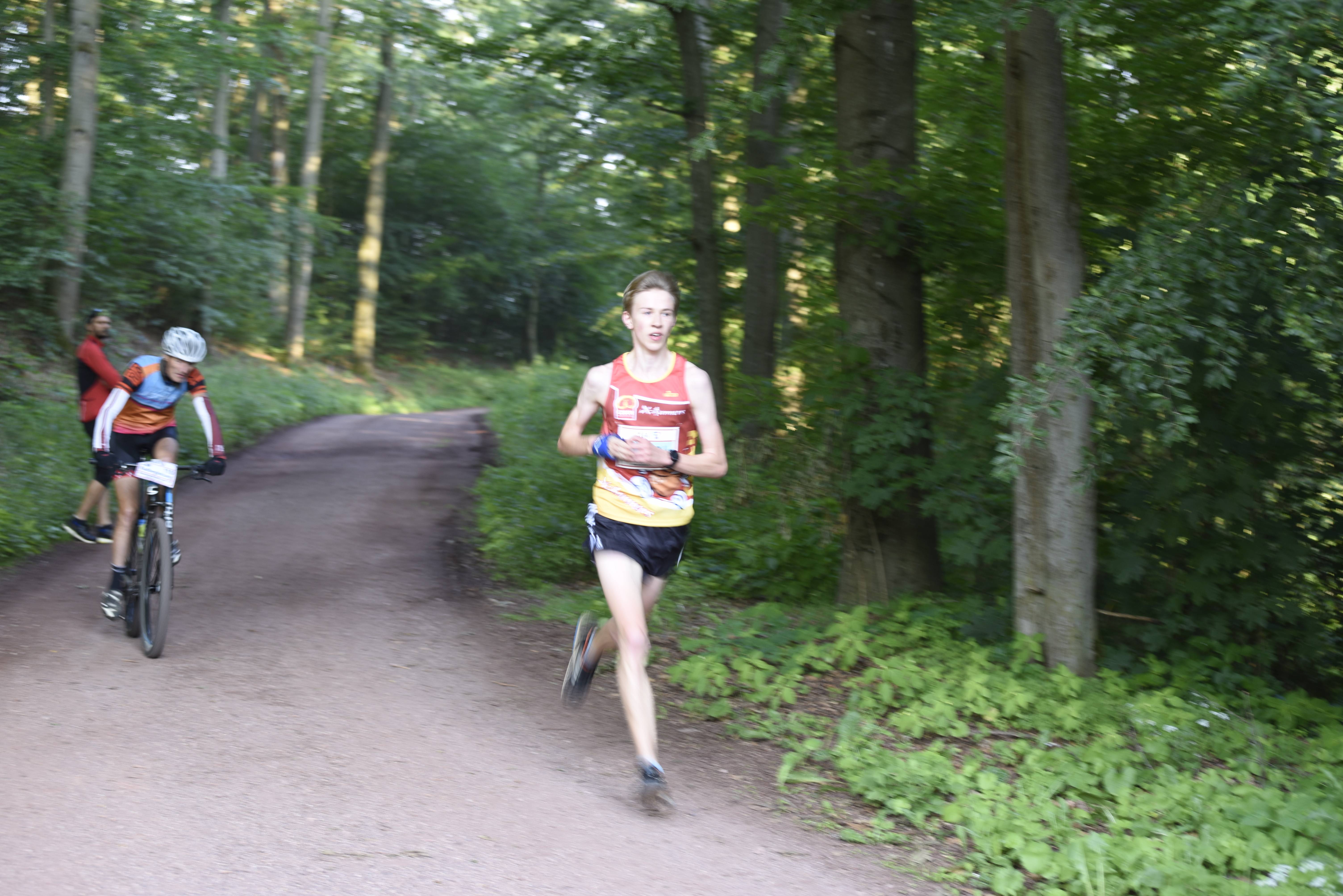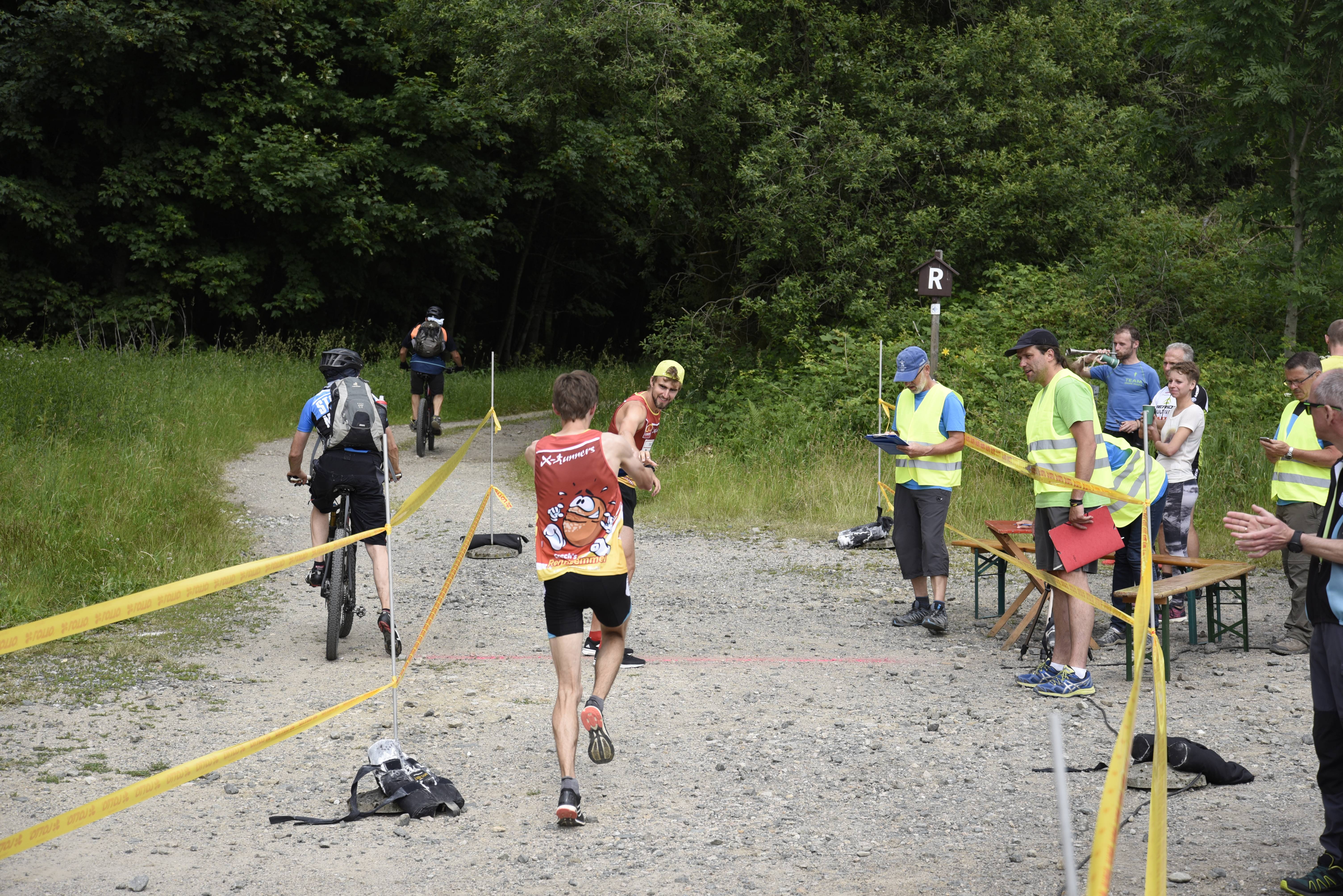 Zurück zum Renngeschehen, wo unsere Orientierungsläufer Fahrt aufnehmen. Marvin Goericke hat nun 4 Radbegleiter, nachdem Routinier Bernd Ballhausen und „Staffelneuling“ Robert Blumenstein in den Sattel gestiegen sind. Eindrucksvolles Bild! Marvin ist mit langem Schritt unterwegs und kann 10 Minuten Rückstand förmlich auffressen. Mit nur noch 1:30min Rückstand übergibt er auf Philipp Müller. Plötzlich kommt der Gedanke: da geht vielleicht doch noch etwas nach ganz vorn. Die weitere Aufholjagd wird durch die Streckenkontrolle ausgebremst, wo unser Läufer mindestens 30 Sekunden wegen Transponderproblemen aufgehalten wird.