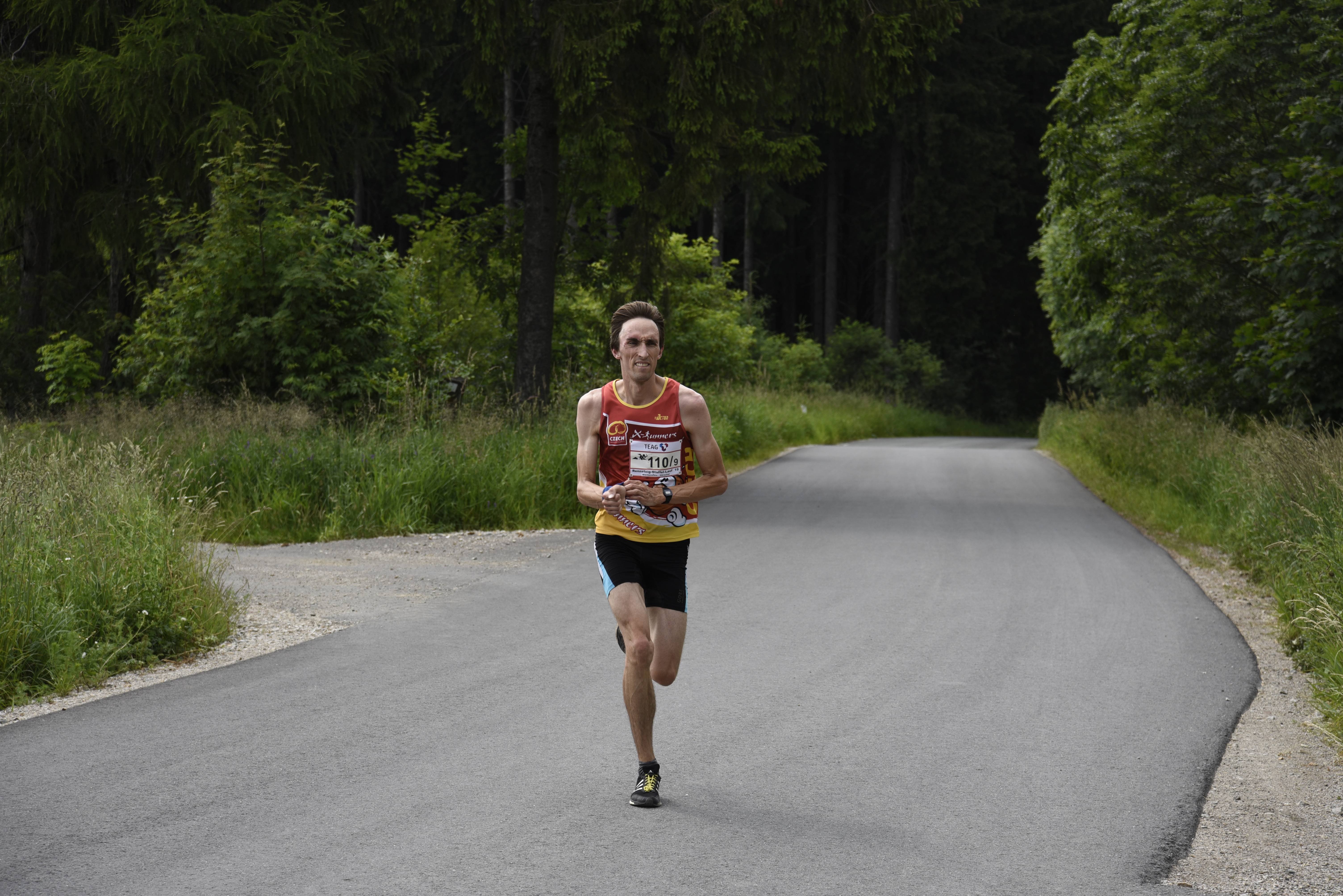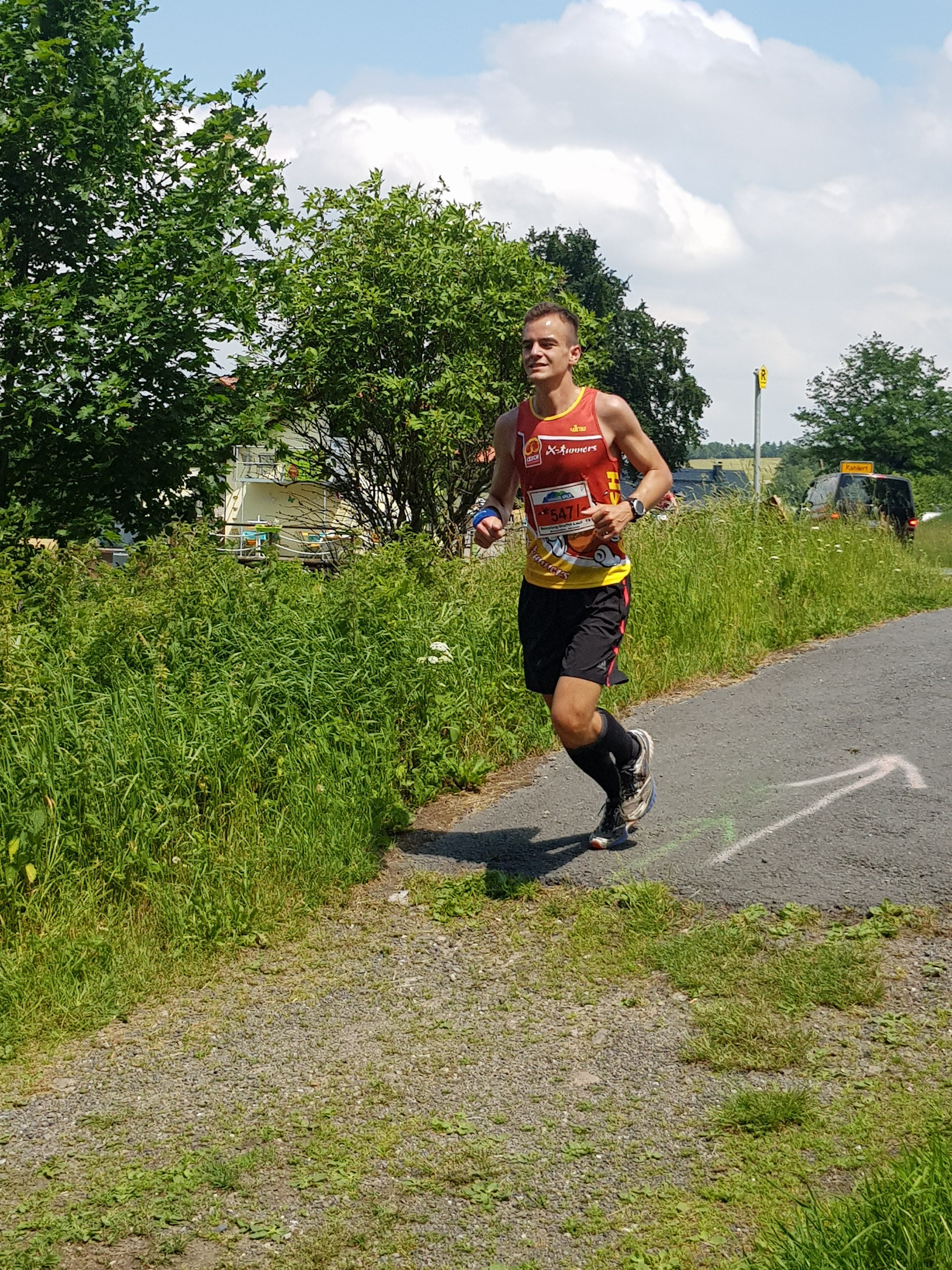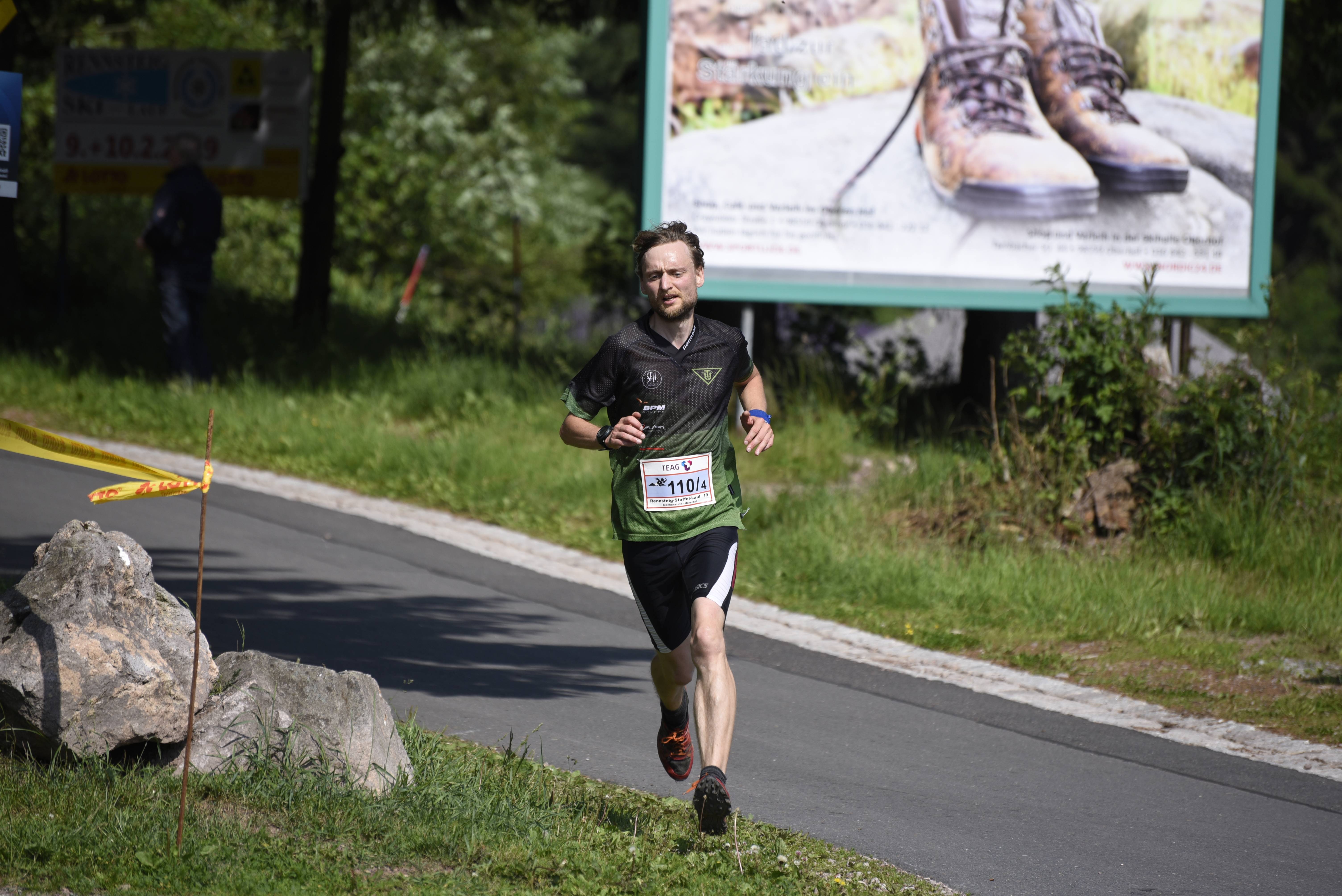 Unser Männerteam 1 wird von Robert Meier beherzt angelaufen. Nach gut 56 Minuten kommt er als 3. Läufer aus dem Wald an der Hohen Sonne und übergibt auf Chunky.