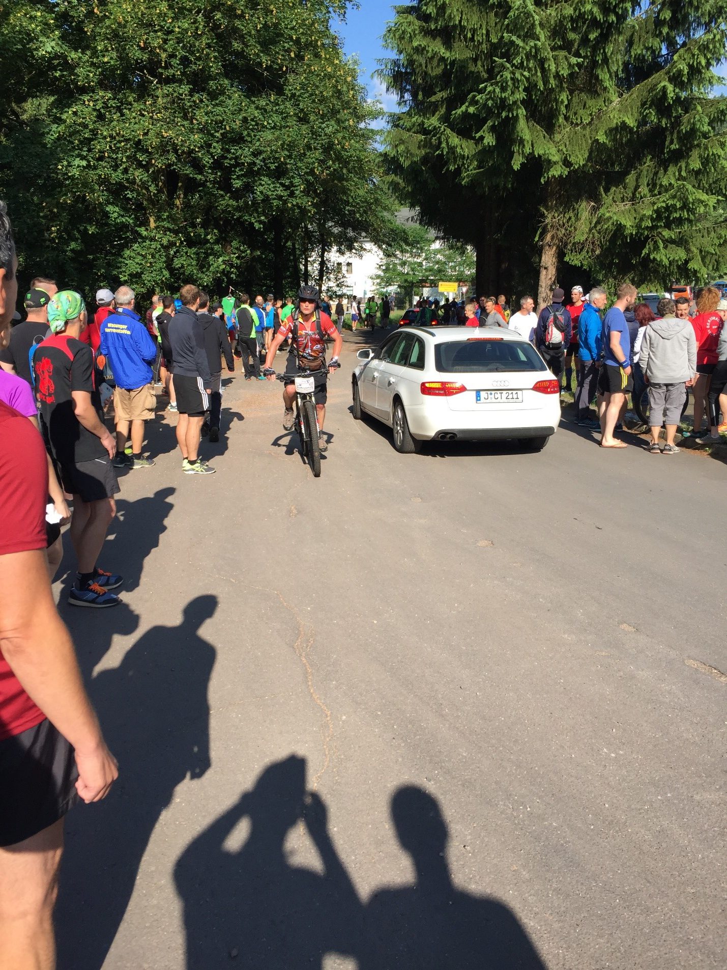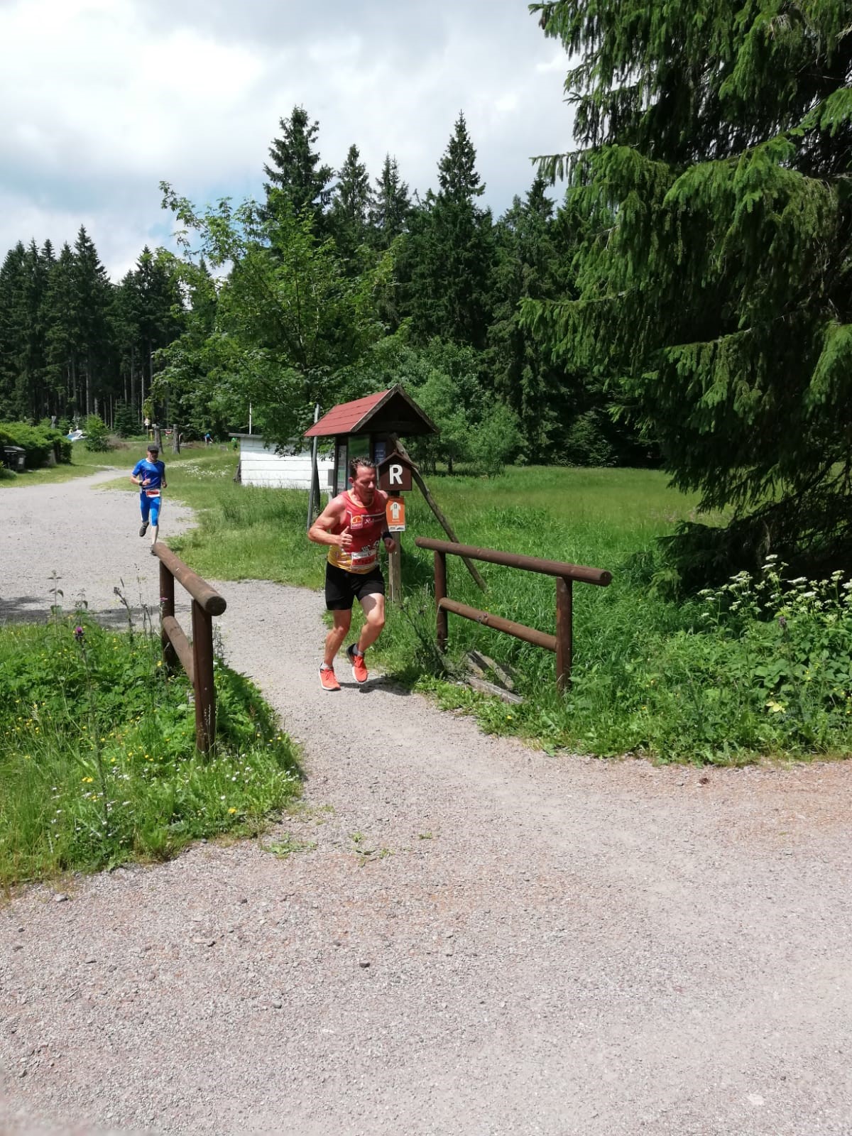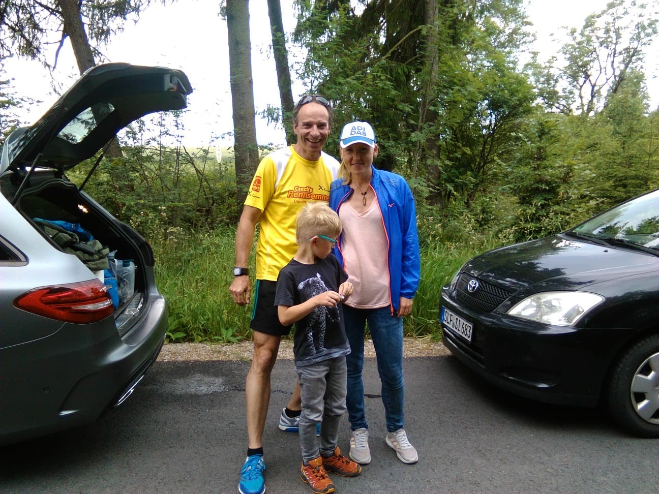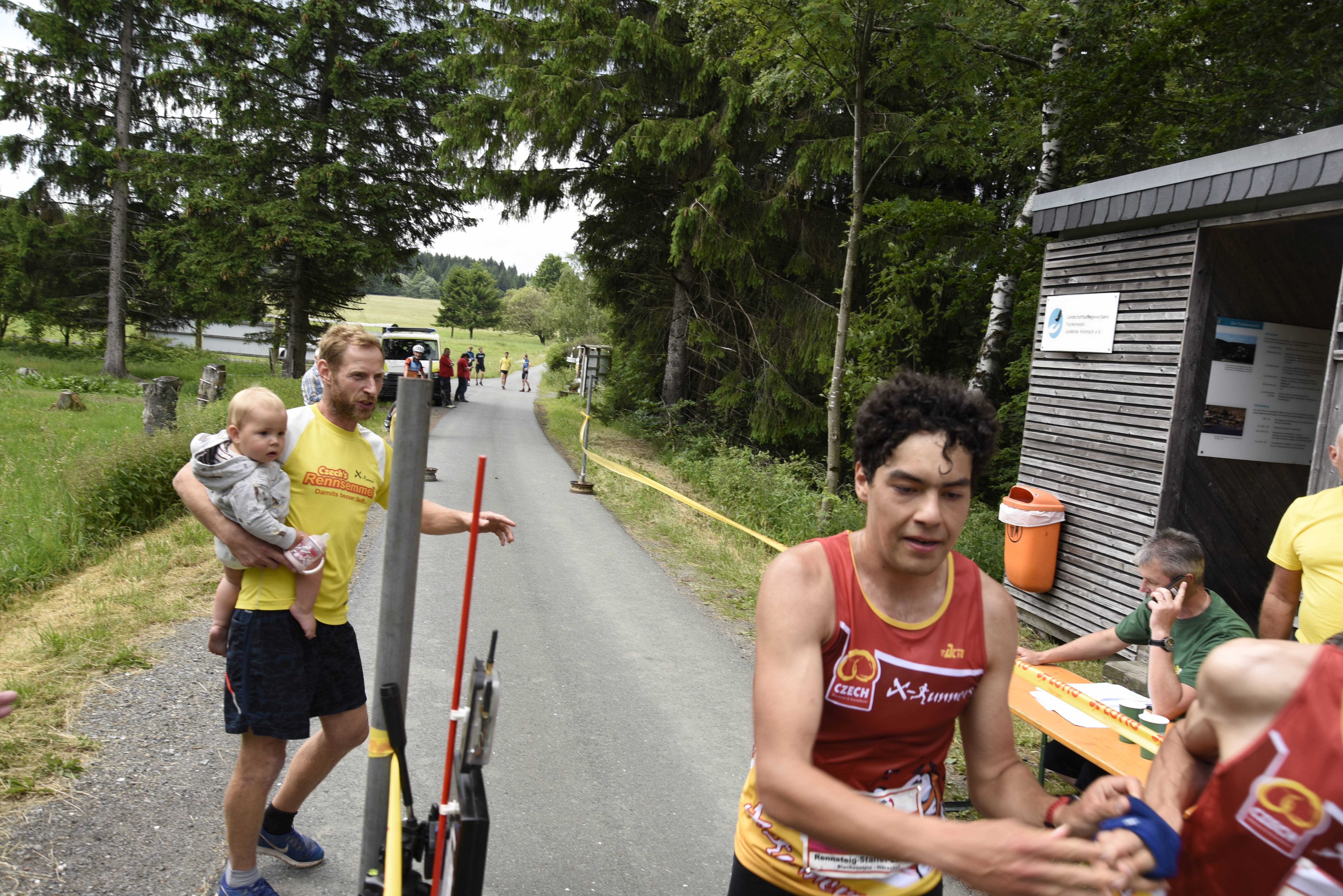 Die Autofahrt von der Ausspanne zum Grenzadler ist weit. Wir schaffen es gerade so, den Wechsel auf Andreas zu erleben, da Maik deutlich unter seiner anvisierten Zeit bleibt. Andreas und Pawel sind mit dem Laufsport Triptis angereist, der erstmalig eine eigene Mannschaft stellt. Wir fahren weiter nach Allzunah. Mit der Ortskenntnis der letzten Jahre gelangen wir auf den kleinen Parkplatz direkt am Wechselpunkt. Hier wartet Daniel, der die zweite Hälfte auf dem Rad begleiten soll. Das mitgebrachte Rad von Alex Jochim wird abgeschnallt und Daniel macht sich schnell mit dem Navi vertraut. Andreas benötigt genau die geplante Zeit und übergibt auf Platz 54 an Pawel. Ulrich fährt noch bis zum Parkplatz an der Triniusbaude weiter, so dass ein gleitender Übergang der Randbegleitung erfolgt. Das Rad wird aufgeladen und Ulrich steigt zu Maik, Margarete und Ingolf ins Auto. Pawel kämpft sich den Trail zum Ersteberg hinauf.