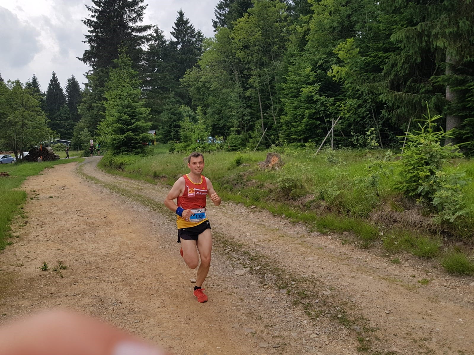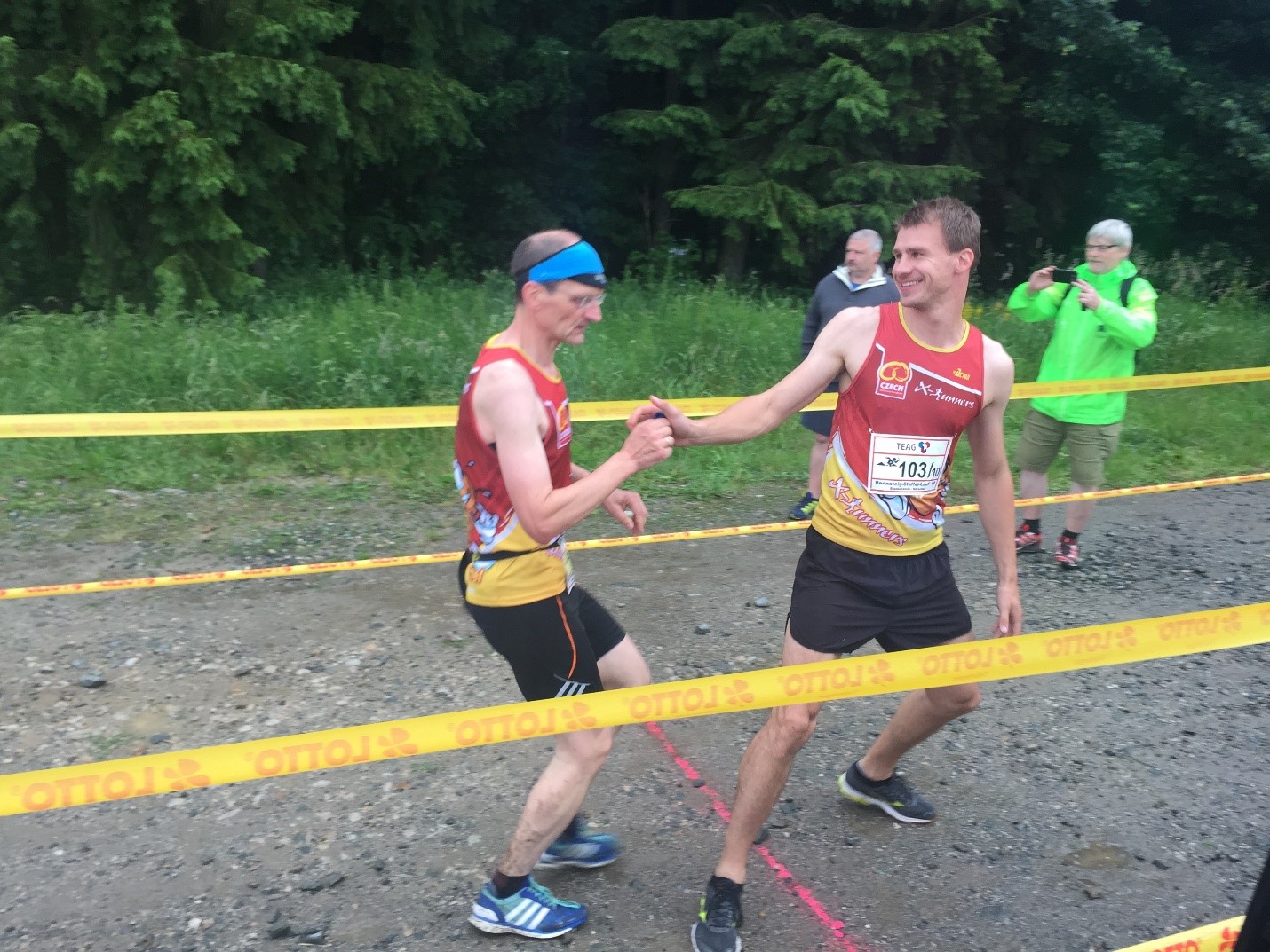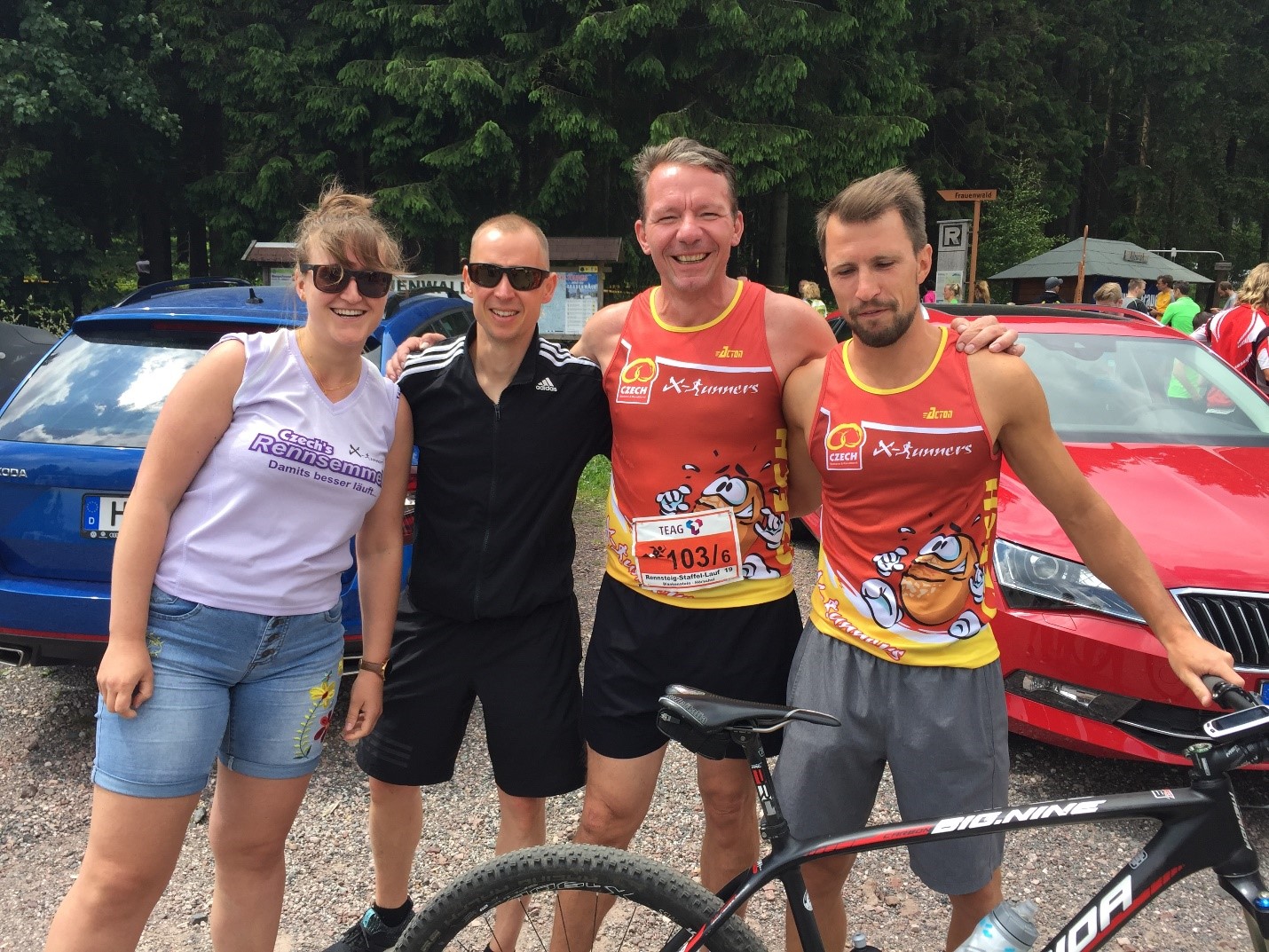 Die Autofahrt von der Ausspanne zum Grenzadler ist weit. Wir schaffen es gerade so, den Wechsel auf Andreas zu erleben, da Maik deutlich unter seiner anvisierten Zeit bleibt. Andreas und Pawel sind mit dem Laufsport Triptis angereist, der erstmalig eine eigene Mannschaft stellt. Wir fahren weiter nach Allzunah. Mit der Ortskenntnis der letzten Jahre gelangen wir auf den kleinen Parkplatz direkt am Wechselpunkt. Hier wartet Daniel, der die zweite Hälfte auf dem Rad begleiten soll. Das mitgebrachte Rad von Alex Jochim wird abgeschnallt und Daniel macht sich schnell mit dem Navi vertraut. Andreas benötigt genau die geplante Zeit und übergibt auf Platz 54 an Pawel. Ulrich fährt noch bis zum Parkplatz an der Triniusbaude weiter, so dass ein gleitender Übergang der Randbegleitung erfolgt. Das Rad wird aufgeladen und Ulrich steigt zu Maik, Margarete und Ingolf ins Auto. Pawel kämpft sich den Trail zum Ersteberg hinauf.