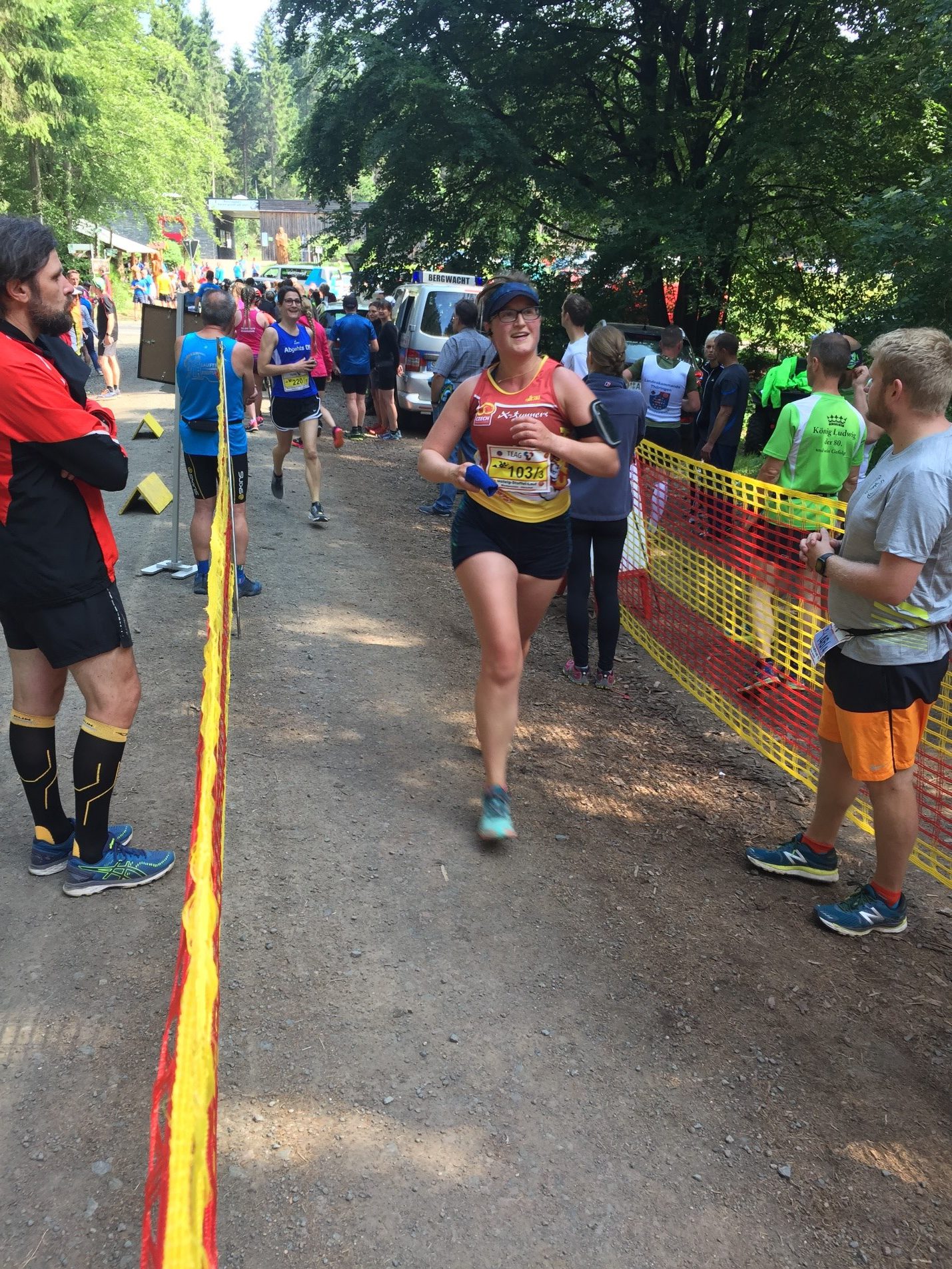 Sarah übergibt mit 1:14:03 an Alex auf Platz 22 und Alex beginnt jetzt fleißig Plätze gut zu machen, da auf der ersten schweren Etappe fast nur Männer die Mix-Teams angelaufen haben. Alex lässt nichts anbrennen und läuft in 1:33:46 eine sehr gute Zeit, bringt damit unser Team auf den 9. Platz. Nun ist Doro gefragt, mit all ihrer Wettkampferfahrung (zum ersten Mal überhaupt bei einem Wettkampf !). Fast ohne Aufregung bringt sie ihre Strecke richtig gut über die Runden und übergibt sich,ach nein, übergibt an Antonia nach 1:19:47. Zu diesem Zeitpunkt liegen wir auf Platz 12 oder 13 in der Mixed-Wertung.