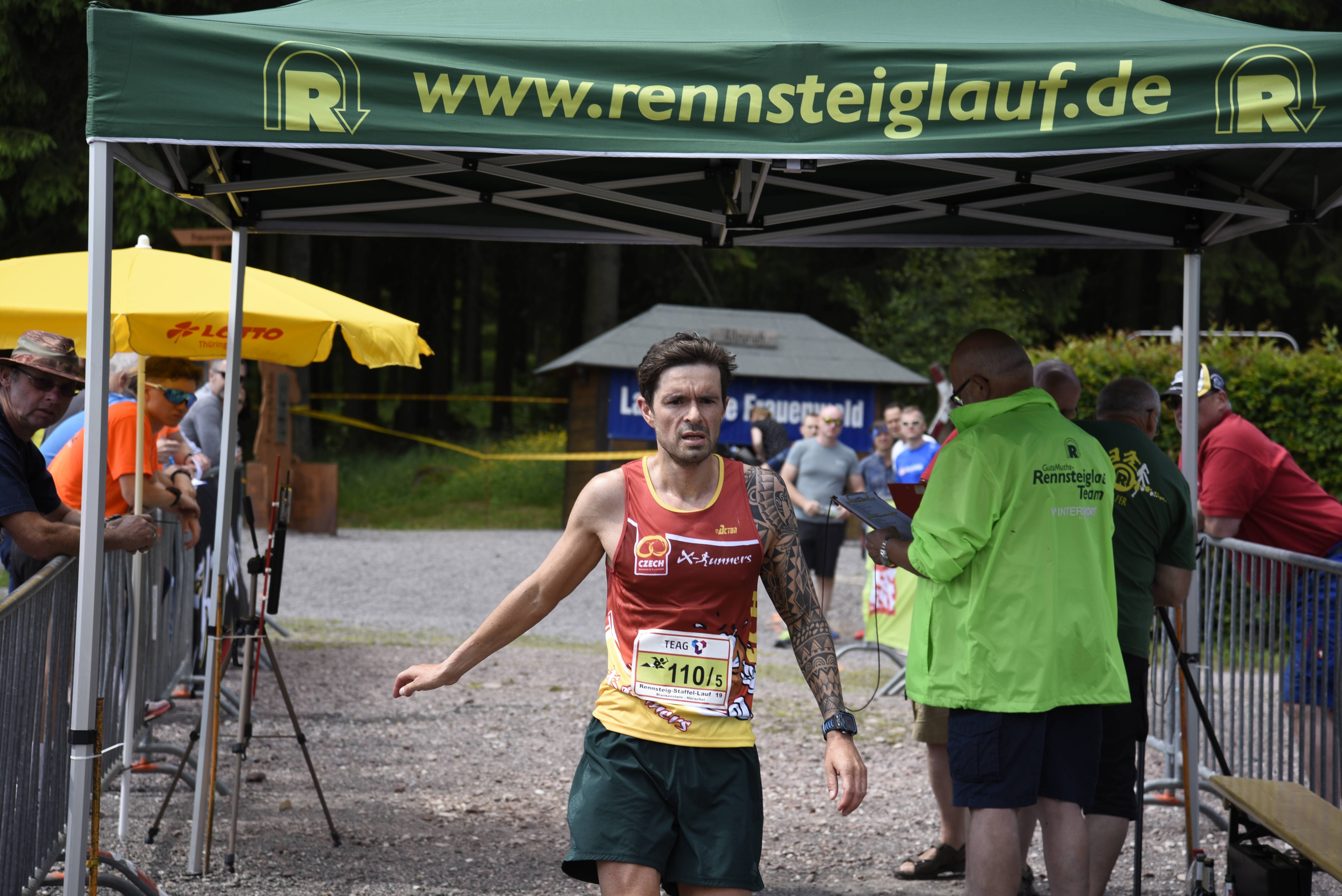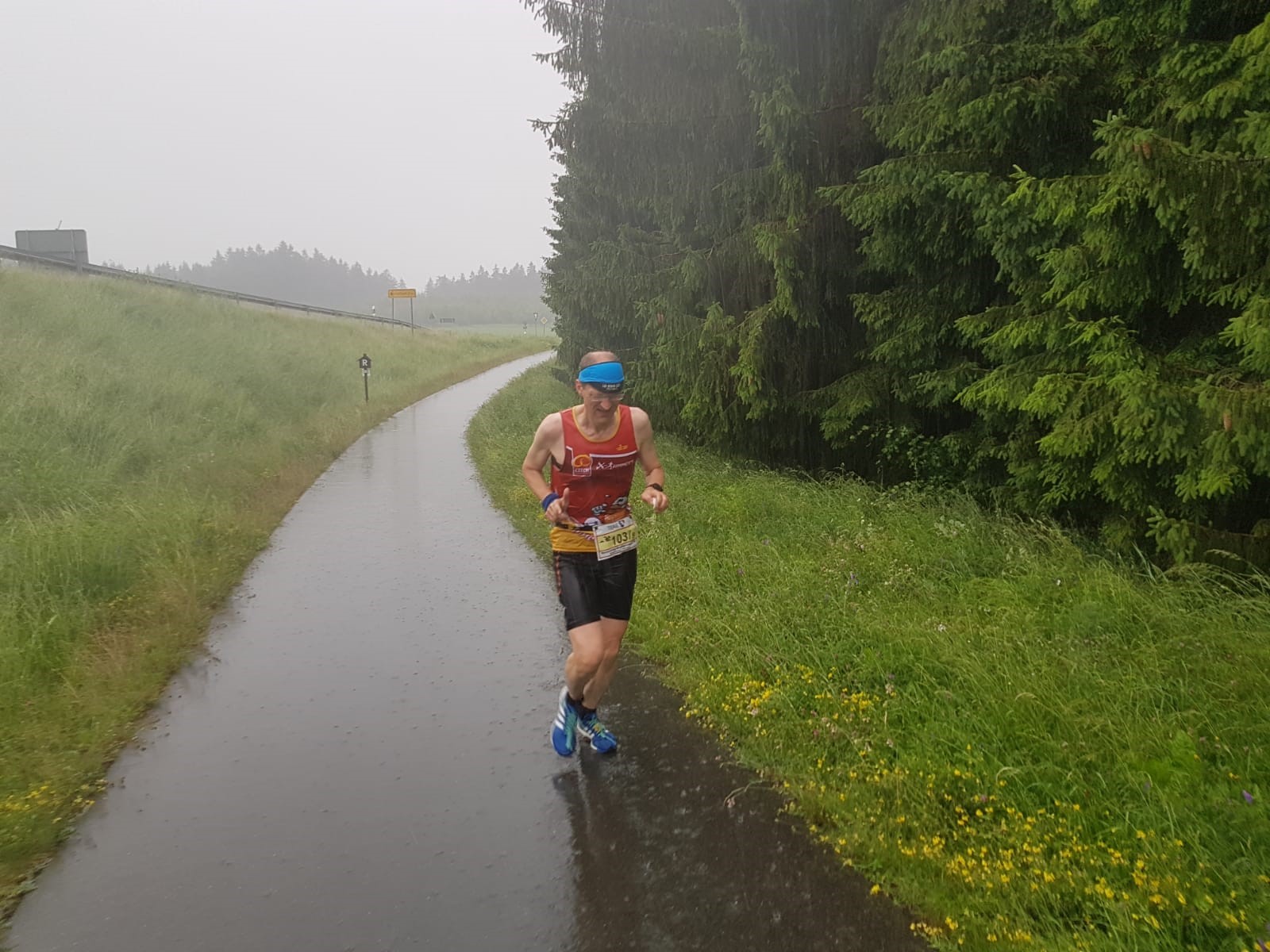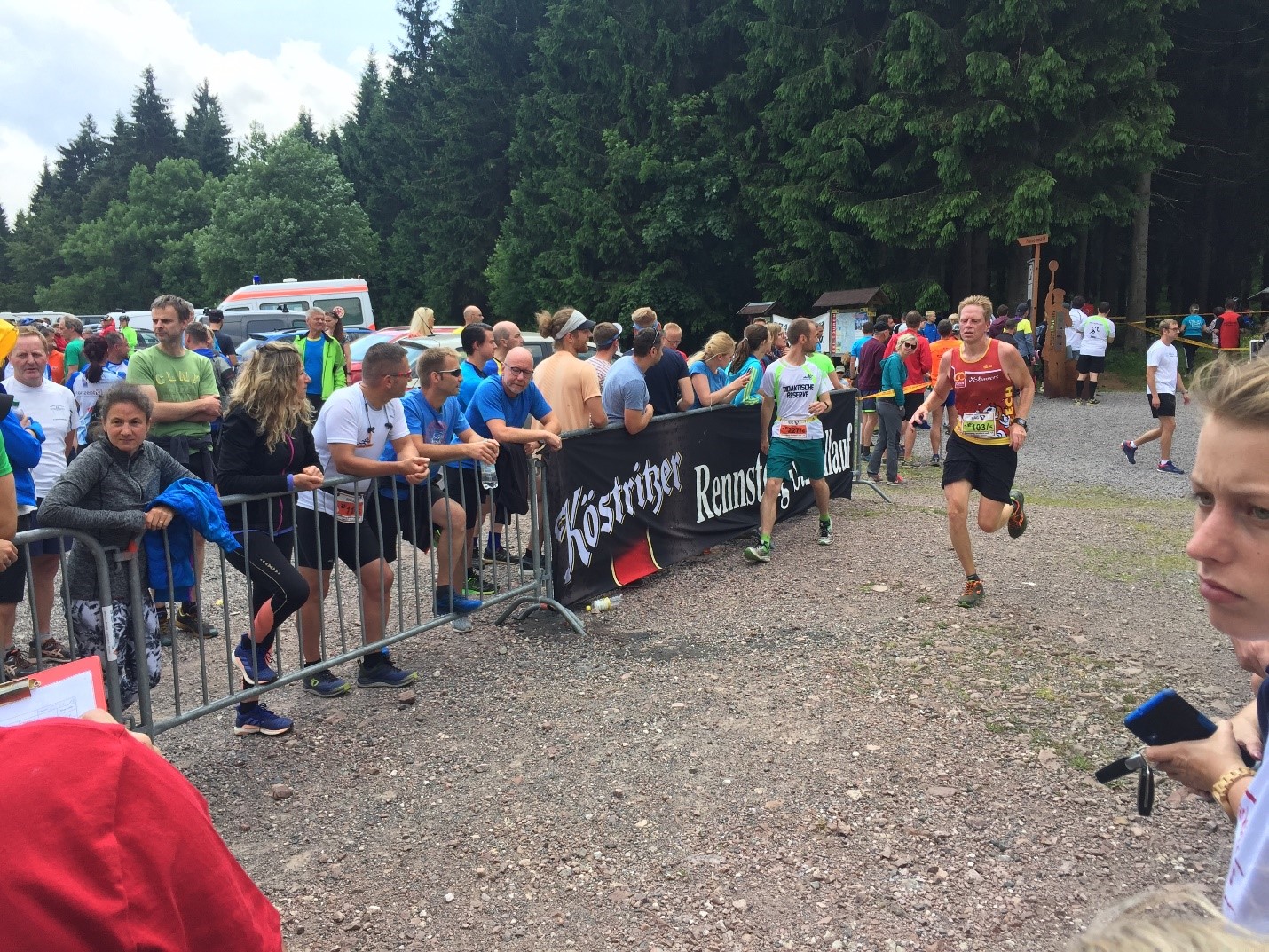 In Masserberg übernimmt Jörg auf Platz 44. In Neuhaus sind wir im vorderen Viertel der Teilnehmerschar angekommen, so dass der Verkehr am Wechselpunkt beherrschbar ist. Ein weiteres Auto stößt zum Team und bringt die letzten 3 Läufer zum Rennsteig. Pünktlich steht Andreas bereit und nimmt als 40. die nächste Etappe in Angriff. Auf dem Weg zur Schildwiese fallen die ersten Regentropfen. Wir hatten uns so gut mit dem Wetter angefreundet, dass niemand bemerkt hat, dass Regenwolken aufziehen. Auch Andreas bringt das Team weiter nach vorn und übergibt auf Platz 38 an Roland.