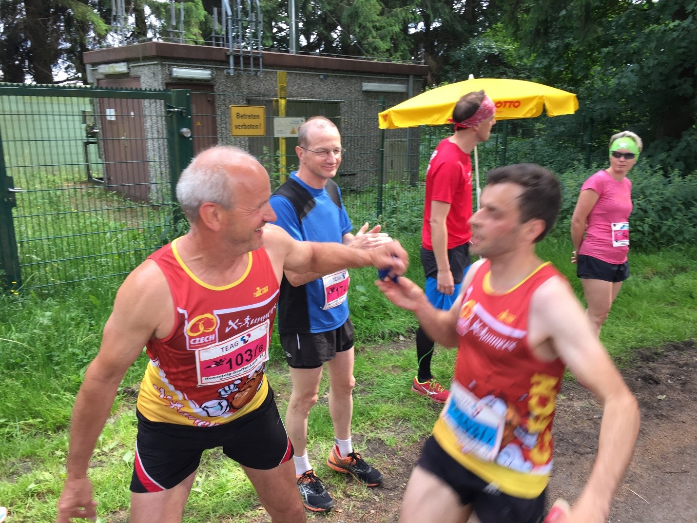 Am Inselsberg herrschte ziemliches Gedränge. Margarete wird von Hagen an den Wechsel gebracht und läuft die Etappe 3. Ralf schwingt sich nach kurzer Erfrischung und einem leckeren Cookie aus der Bäckerei Czech auf sein Rennrad und radelt zum nächsten Bahnhof. An der Neuen Ausspanne erfährt das Verkehrschaos noch eine Steigerung. Der kleine Parkplatz ist völlig überlastet. Hier übernimmt Maik von Margarete den „Staffelstab“. Er war erst am Donnerstag nach der Absage von Maik Berrang eingesprungen. Er erweist sich als eine zuverlässige Bank und bringt das Team von Platz 110 auf Platz 71.