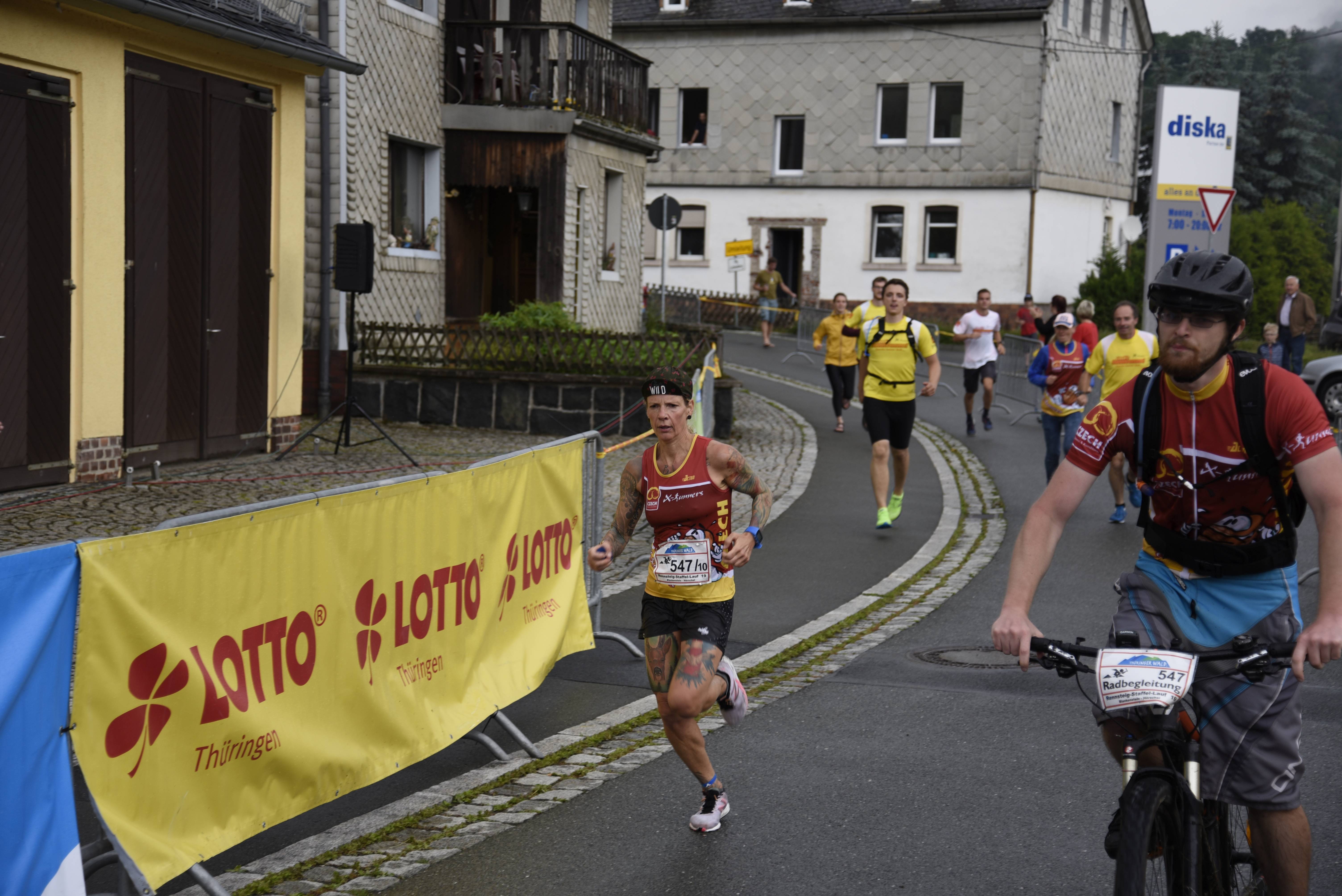 Am Grenzadler hat Wieland nach vorn nichts mehr eingebüßt und schickt Patrice Walter auf die längste Etappe über den Beerberg nach Allzunah. Die zweite Position wird ausgebaut und nach vorn der Abstand um ein Minütchen verringert. Bis hierher waren Andrè Bräuer und Henry Schneider als Radbegleiter offiziell unterwegs und habe tolle Arbeit geliefert. Und sie haben noch nicht genug, wollen weiterfahren. Das geht nur, weil einmal mehr Frank Hausmann den Transporter überführt und sich seit dem Start als Backup-Läufer zur Verfügung hält.