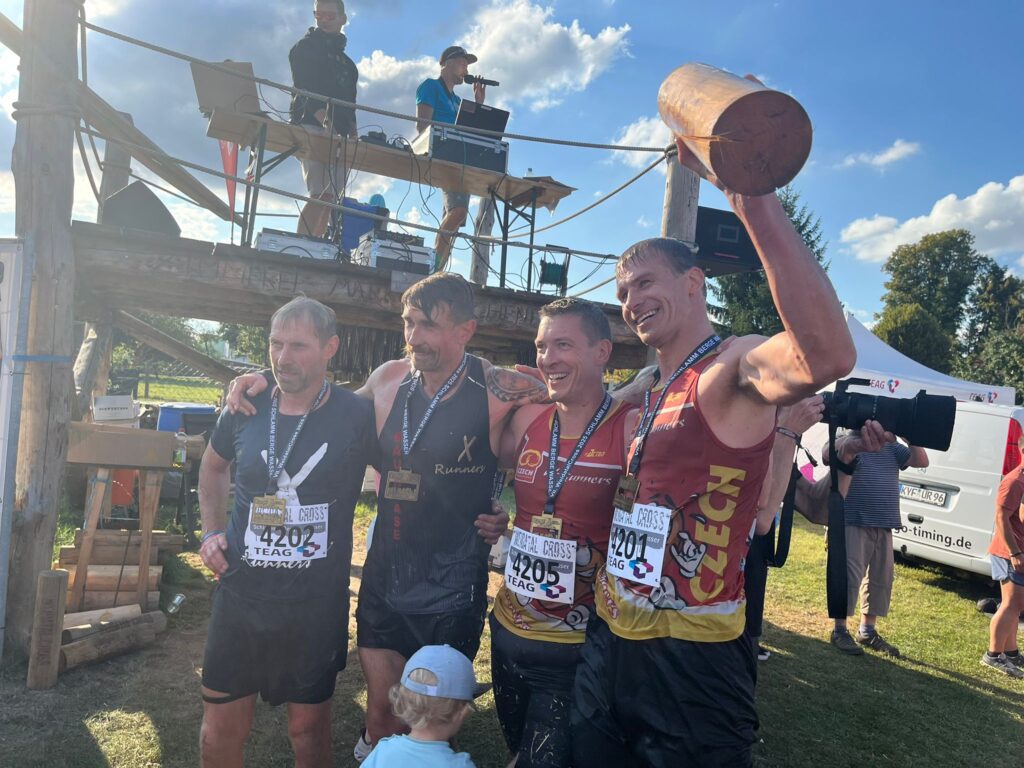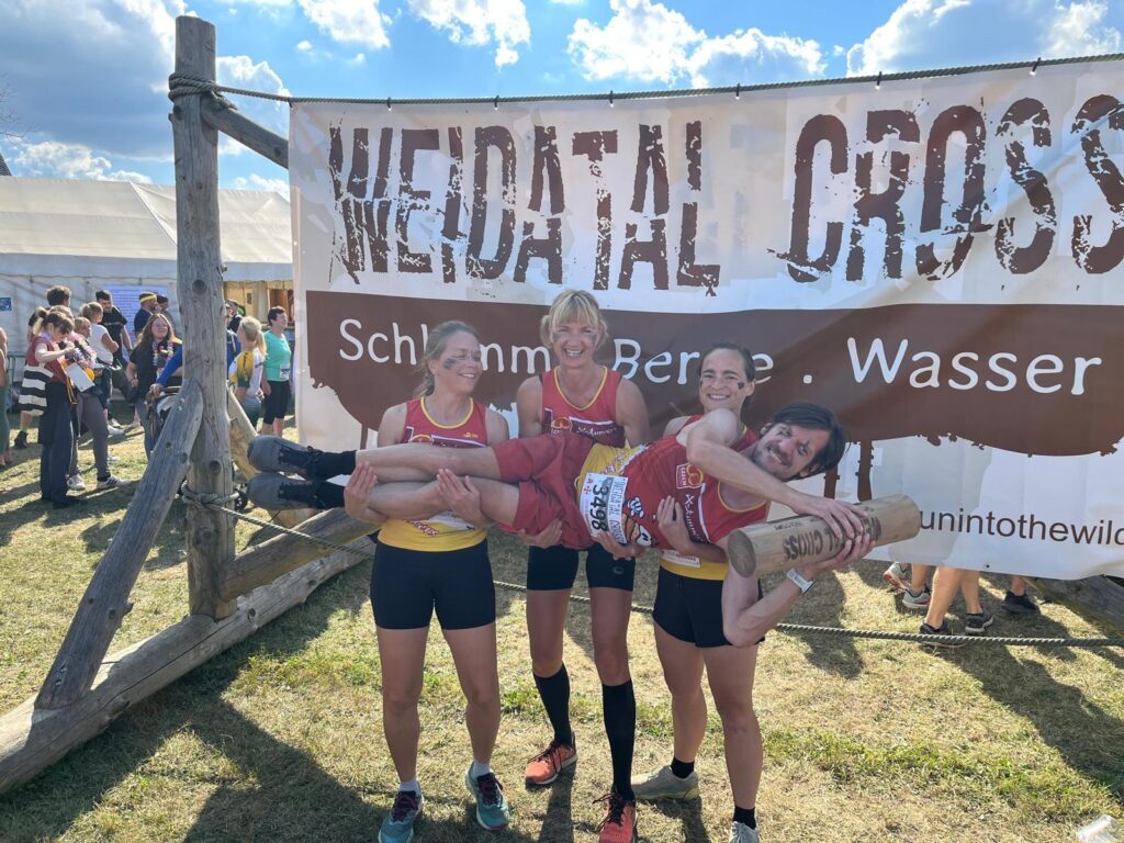 Parallel dazu wagten sich Frank, André, Flo und Paul ins Teamrennen. Die Zusatzaufgabe: Einen überdimensionalen Holzstab über die gesamte Distanz tragen, der dabei niemals den Boden berühren sollte. Klingt simpel – war es eigentlich auch, weil sich alle gegenseitig hervorragend unterstützten.