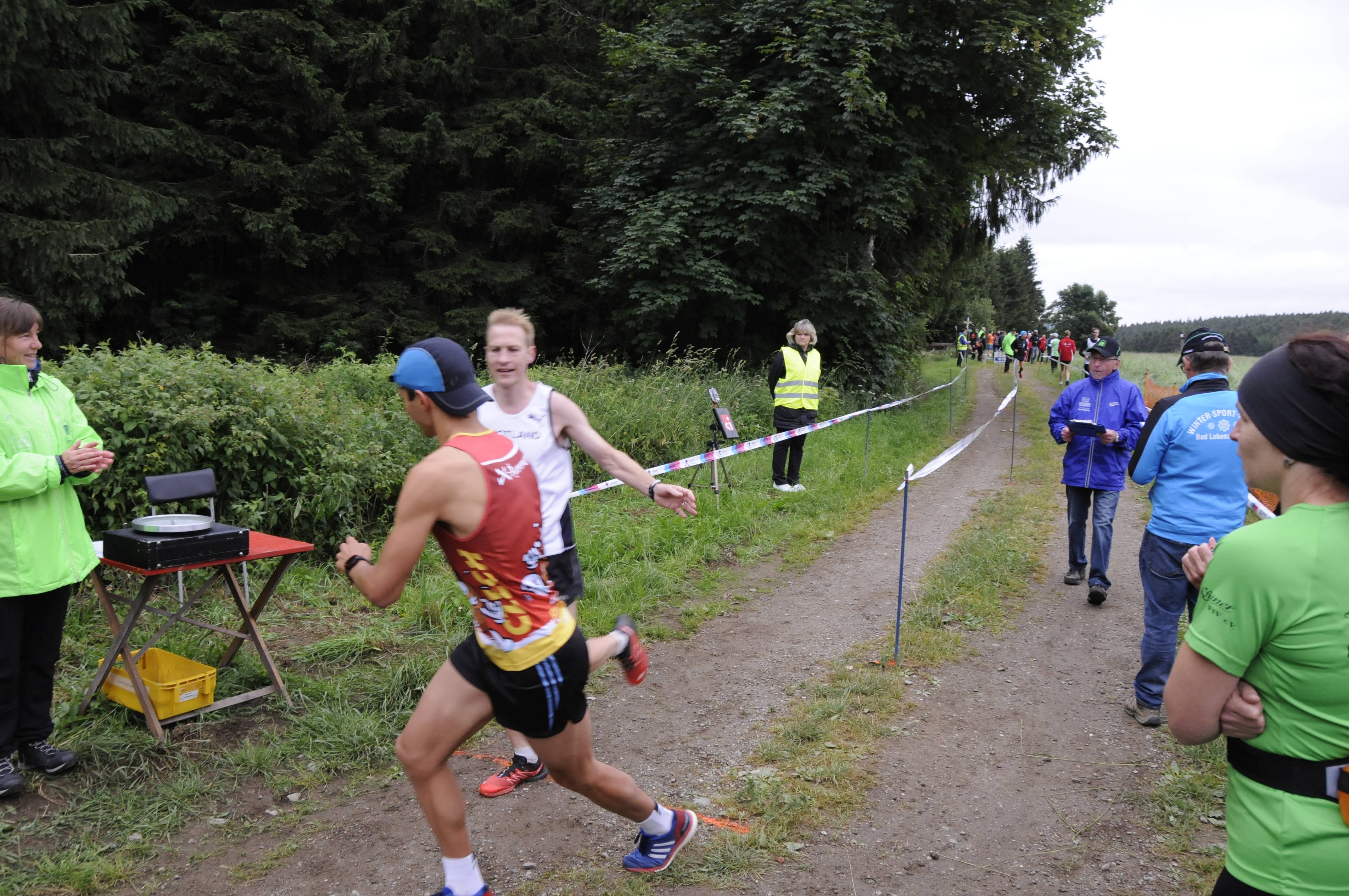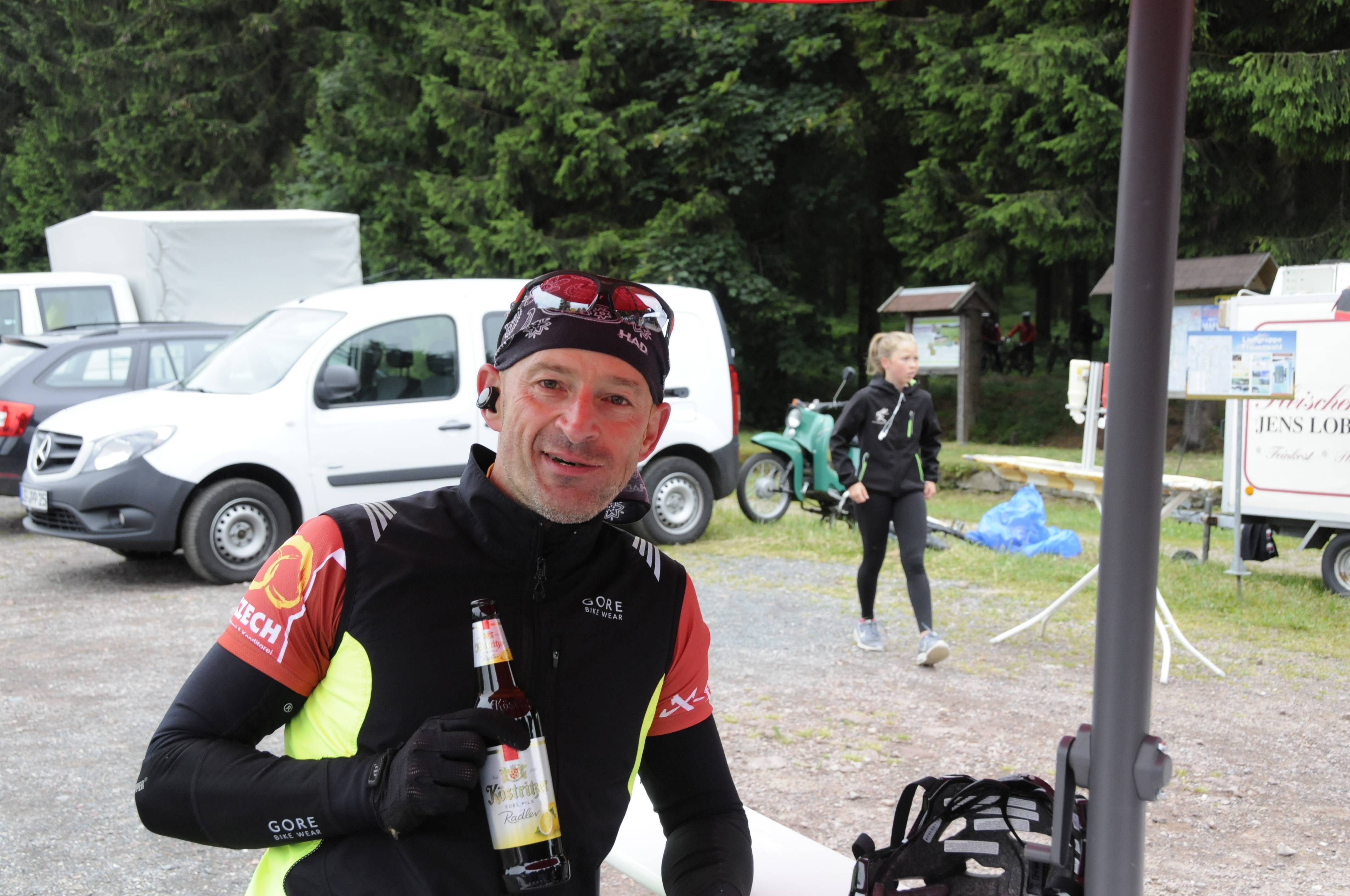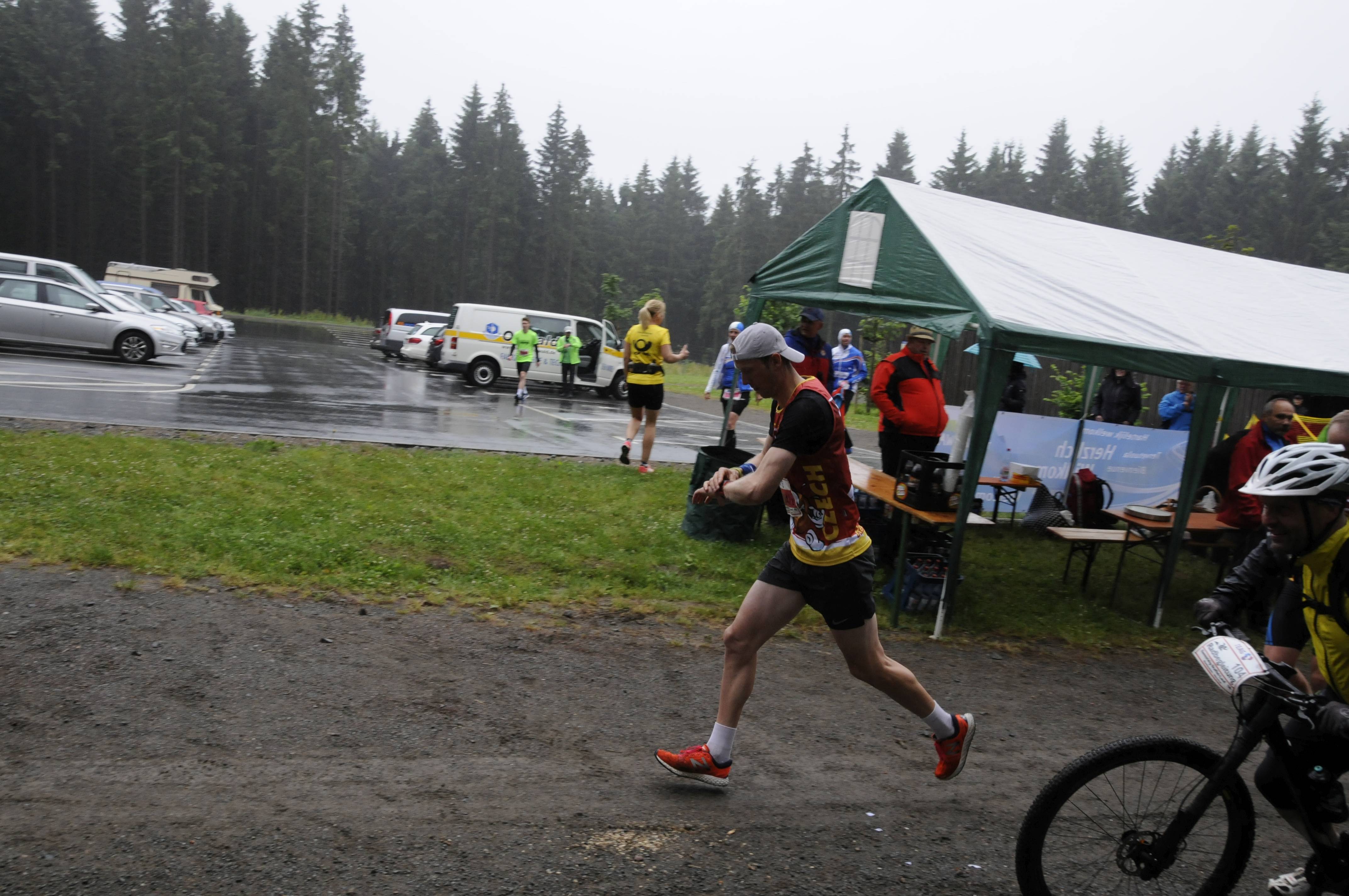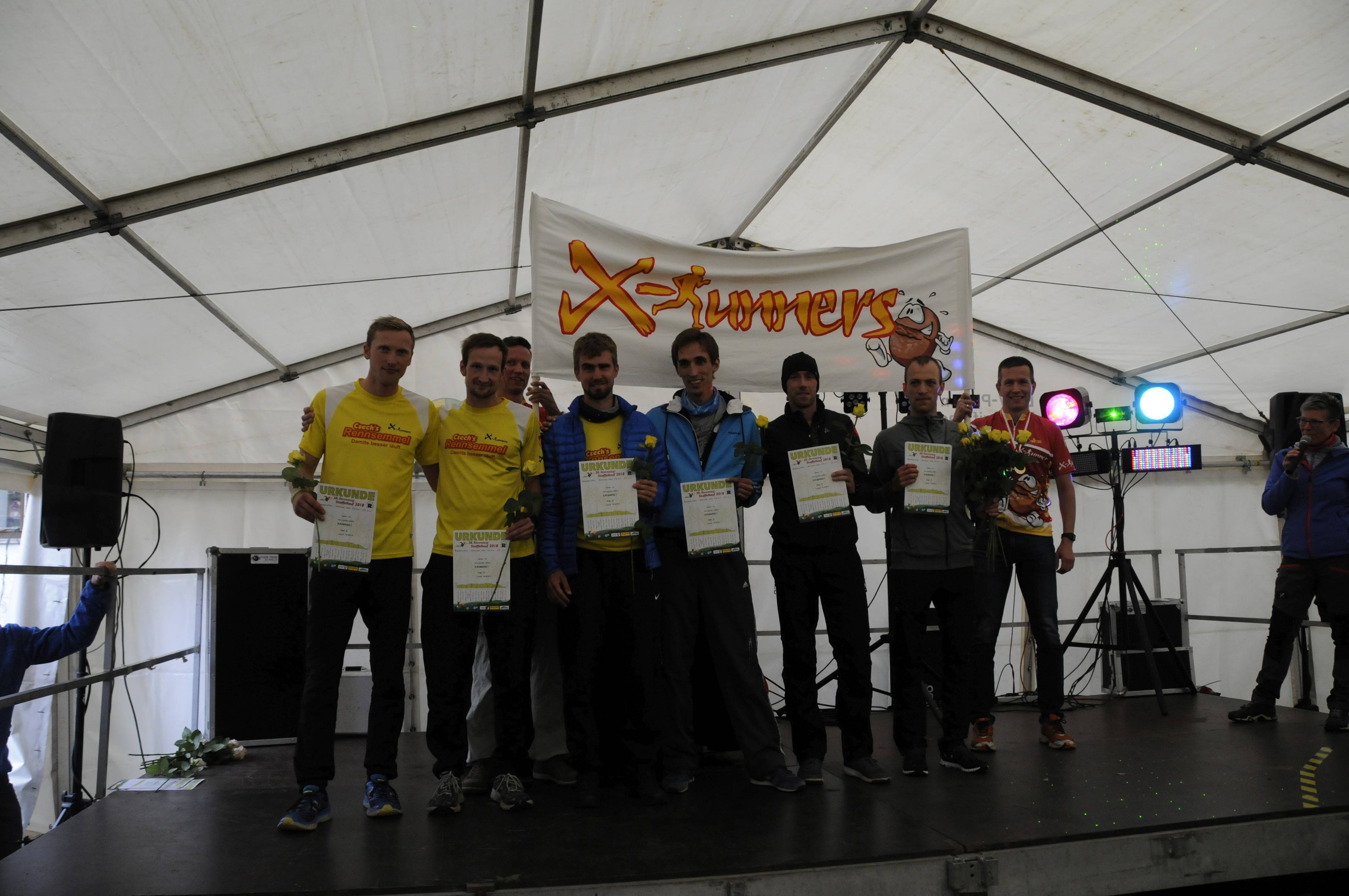 Für Männer 1 gab es im Vergleich zum Vorjahr nur eine Veränderung. Stephan Holesch musste verletzungsbedingt passen. Für ihn rutschte Patrice Walter ins Team. An dieser Stelle auch danke an seinen Team-Geist, dass er sich zunächst für das Mixed-Team bereithielt und dann aufrutschte. Stephan war trotzdem dabei und gestand, dass er in der Begleiter-Rolle ebenso aufgeregt sei, wie die Vorjahre als Läufer (Willkommen in dieser Perspektive). Chunky Liston nutzte den Ansporn als junger Vater, übergab als erster und verbesserte sich zum Vorjahr um über eine Minute. Theo Popp (ebenfalls frischgebackener Papa) baute den Vorsprung eine weitere Minute aus. Selbiges gelang Sebastian Seyfarth auf dem 3. Abschnitt. Patrice konnte die Zeit von Stephan aus Vorjahr leicht unterbieten und den Vorsprung halten. Willi Paufler auf der ihm bekannten 5. Etappe packte noch eine Minute Vorsprung drauf (inzwischen auf mehr als 4 Minuten angewachsen). Zu diesem Zeitpunkt hatte Bernd Ballhausen seine Radbegleitung bravourös absolviert und die Bratwurst und das Radler mehr als verdient. Für die Königsetappe über den Beerberg schnürte Florian Lecht die Schuhe und konnte den Abstand zu Günter`s Männern in Kenianischer Besetzung nahezu konstant halten. Der Rennsteiglaufverein lief hier fast auf Platz 2 auf; damit waren am 6. Wechsel 3 Teams binnen 4 Minuten unterwegs. Tobias Schröder packte in tiefen 49 min auf Etappe 7 eine Bestzeit aus. Bei nunmehr nicht untypischer Witterung mit Regen und einstelligen Temperaturen übernahm Lucas Schädlich die konstante Führung. Er unterbot seine Vorjahres- und Planzeit. Trotzdem kamen die Verfolger auf. Thomas Häusler nahm knapp 2 Minuten auf die beiden Verfolger mit. Als er etwa nach etwa der Hälfte der Strecke von Marcel Krieghoff überholt wurde (ein „ebenso bekannter Wintersportler, wie viele andere eingekaufte Läufer“ 😉 hielt Thomas den Abstand bis zum Wechsel auf ca. 20 Sekunden konstant. Zugleich verbesserte er seine All-Time Bestzeit auf dieser Etappe auf unter 1:09 Stunden und vergrößerte den Abstand nach hinten. Marius Faber versuchte sofort nach vorn aufzulaufen. Als er merkte, dass dieses womöglich über die Kräfte geht, lief er kontrolliert zu eigener Bestzeit und wurde nach knapp 2 Minuten Rückstand als Zweiter gefeiert. Die Radbegleitung teilten sich Hagen Voigt und Andrè Bräuer. Die 10:32:31 Stunden bedeuteten Vereinsrekord. In Anbetracht dessen, dass auch unsere geplante Zielzeit um 2 Minuten unterboten wurde, kann man nur sagen: Tolles Mannschaftsergebnis!