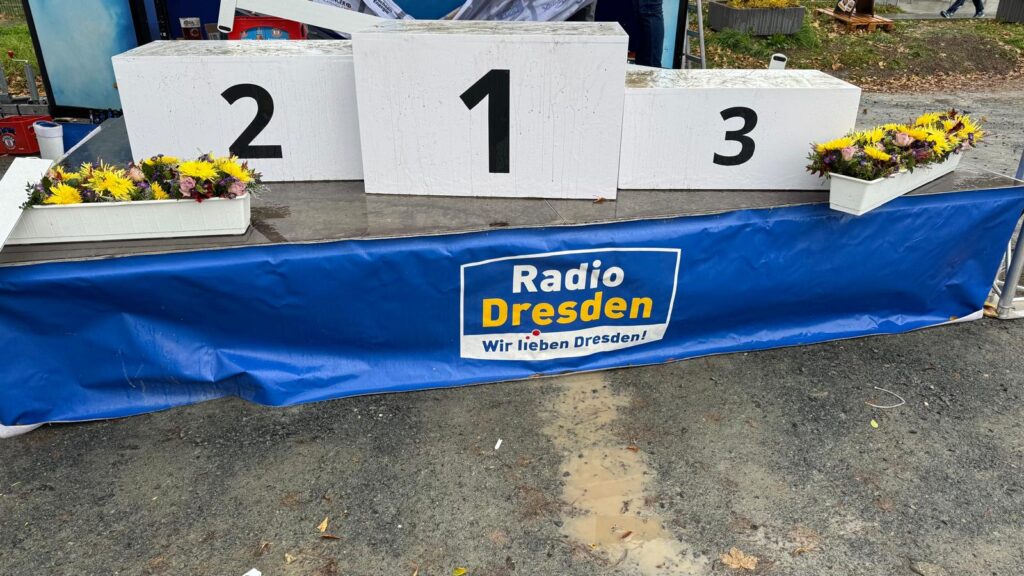 Aus der Erfahrung im vergangenen Jahr heraus hatten sich Anke und Doro dieses Jahr sehr zeitig auf den Weg zu ihren Wechselstellen an der Waldschlösschenbrücke und der Gläsernen Manufaktur gemacht, was Doro allerdings nicht davor bewahrte, in die falsche Bahn einzusteigen und in entgegengesetzte Richtung zu fahren. An der Logistik und dem Lesen von Fahrplänen müssen wir für das nächste Jahr noch arbeiten. Manu kam währenddessen mit dem Fahrrad zur 1. Wechselstelle, die auch gleichzeitig die 3. Wechselstelle war.