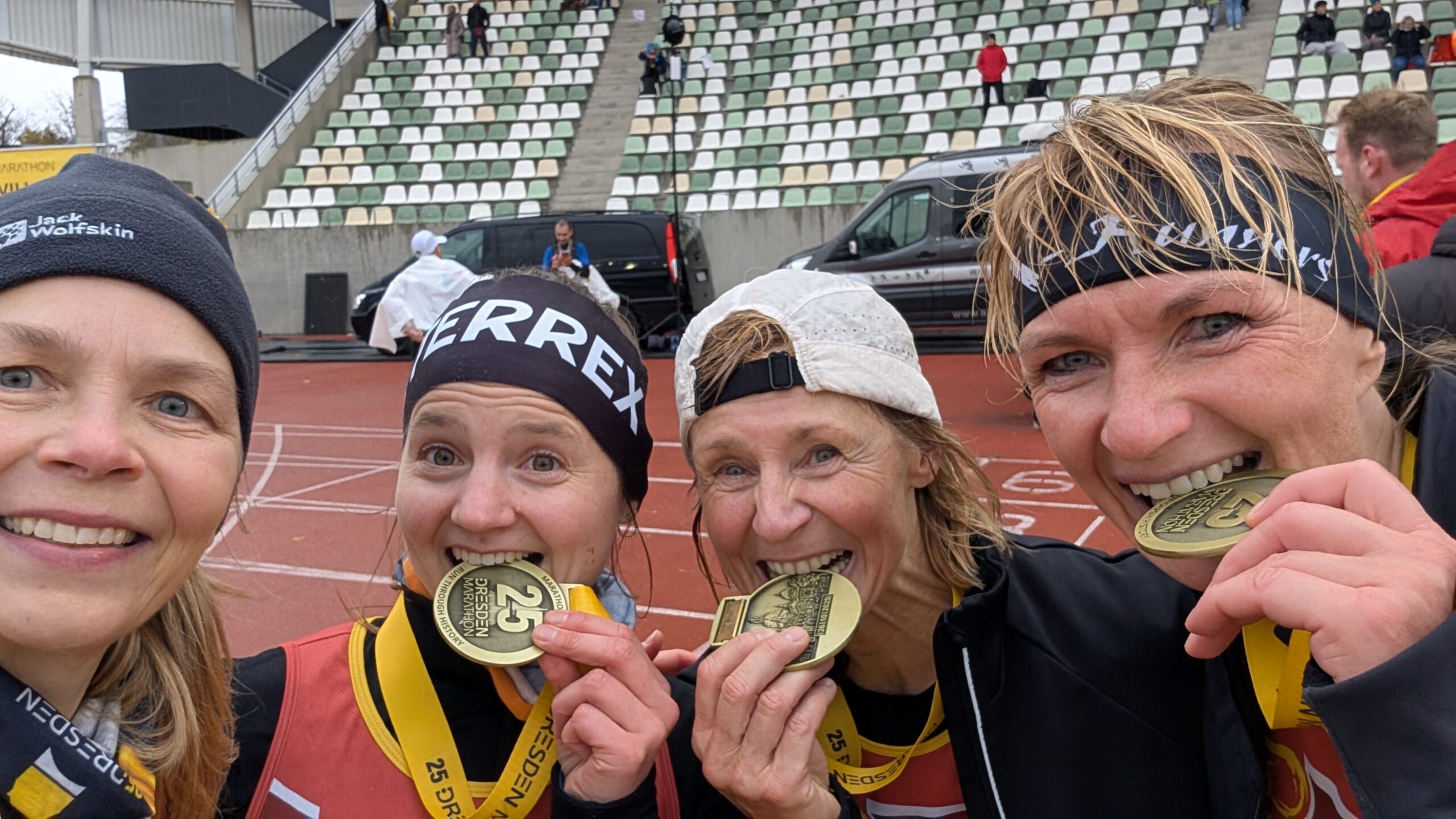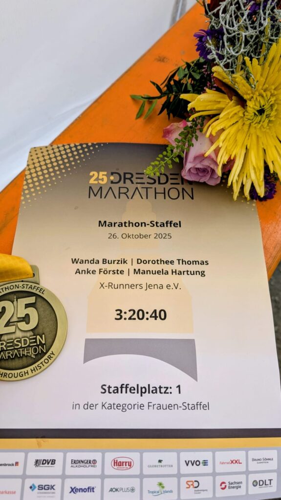 Keine Frage, wir – Wanda, Doro, Anke und Manu – waren angefixt durch unsere erstmalige und erfolgreiche Teilnahme als Frauenmarathonstaffel im vergangenen Jahr. Am 26.10.2025 ging es für uns also wieder nach Dresden zum Jubiläumsmarathon.