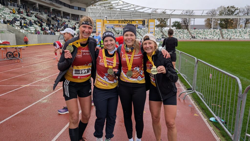 Manu, inzwischen ebenfalls fast ausgekühlt, wartete währenddessen auf Anke; immer noch an der Wechselstelle “Gläserne Manufaktur”, es wurde kälter und windiger, fast stürmisch und nasser. Das Wetter war bescheiden, doch wir blieben hoch motiviert, eine vordere Platzierung zu erreichen. Anke übergab völlig durchnässt auf Manu für die 4. und letzte Etappe. Nur noch 7,3 km bis zum Ziel und damit nochmal ein Endspurt für Anke, sich so schnell wie möglich Wechselsachen über zu werfen und von der Gläsernen Manufaktur zum Heinz-Steyer-Stadion zu radeln, um den gemeinsamen Zieleinlauf nicht zu verpassen. Wir verfolgten Manu über das Live Tracking. Sie war richtig schnell unterwegs, für Anke zu schnell. Just in dem Moment, als Doro und Wanda in den Lauf von Manu mit einstiegen, hatte sich Anke durch Wind, Wetter und Zuschauer gekämpft. 32:32 Minuten haben bei dem Wetter doch nicht gereicht. Trotz Bitten und Überredungsversuchen gegenüber den Ordnern blieb ihr leider der gemeinsame Zieleinlauf verwehrt und Wanda, Doro und Manu liefen ohne sie die Stadionrunde und damit die letzten Meter bis zum Ziel. Das war unglaublich schade. Gern hätten wir doch alle gemeinsam diesen überraschenden Moment im Ziel genossen, denn wir trauten unseren Augen kaum, als wir unsere Platzierung auf der Anzeigetafel im Stadion sahen: 1. Platz, X-Runners Ladies!