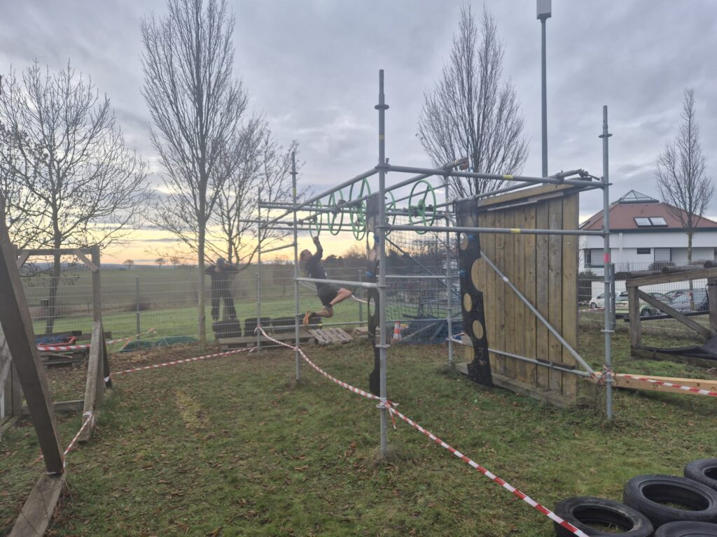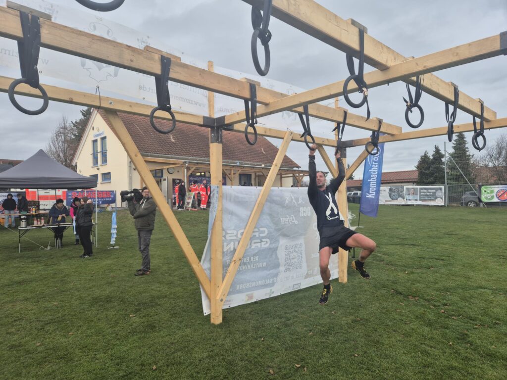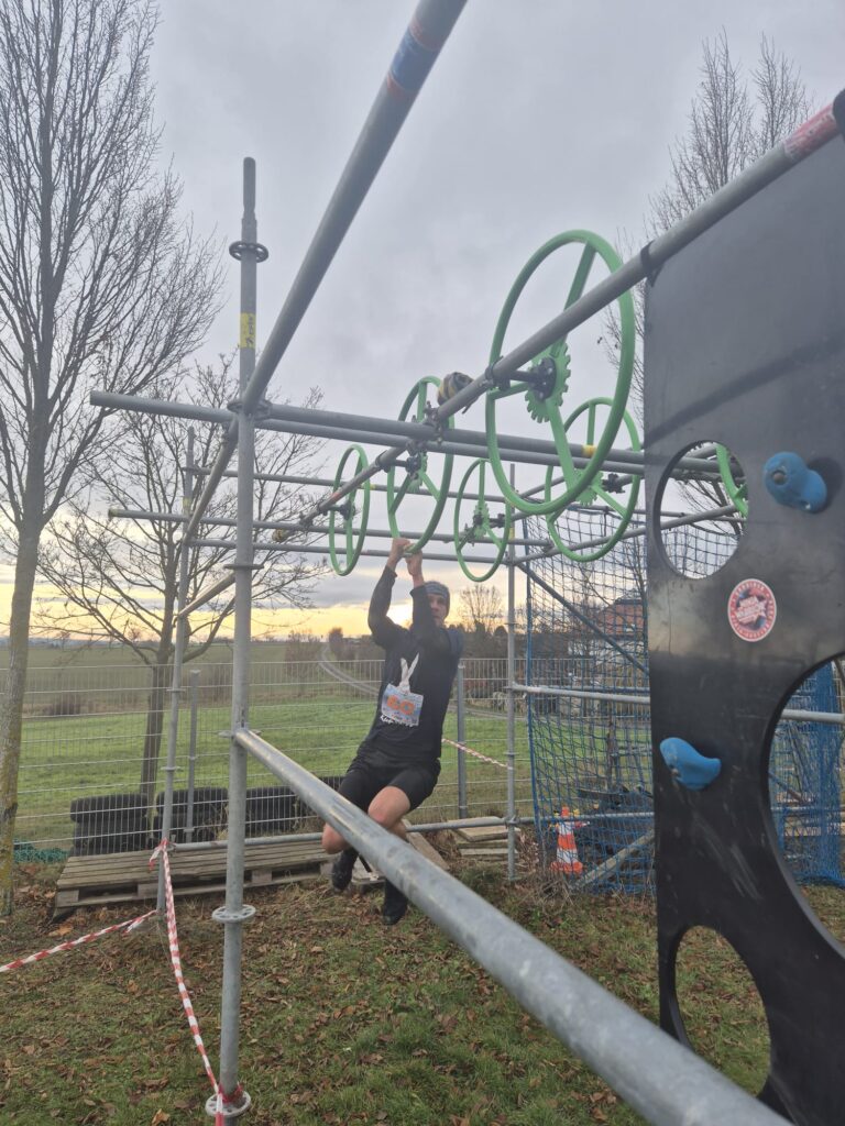 Auf der Strecke folgte eine abwechslungsreiche Mischung aus Laufpassagen und weiteren Klassikern. Mehrere Eskaladierwände und andere klassische Hindernisse verlangten Technik und Explosivität, während Reifen an einer Schnur kontrolliert aufgerollt und damit nach oben gezogen werden wollten. Kurz vor dem Ziel wartete nochmals der Wassercontainer, bevor es mit klammen Fingern in den Hangelparcours im Stadion ging. Hier musste technisch etwas anspruchsvoller zunächst an Stangen, dann an Ringen und letztendlich an vier großen Rädern entlangehangelt und zwischendurch auf schmale Platten umgestiegen werden. Mit gefrorenen Händen wahrlich kein ganz so leichtes Unterfangen.